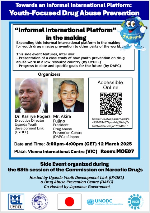 民間団体として40年近く国内の薬物乱用防止活動を牽引してきた公益財団法人麻薬・覚せい剤乱用防止センター(以下当財団)はこの度、ウィーンで開催された国連麻薬委員会第68会期において、ウガンダのNGO団体と共催にてシンポジウムを開催しました。このシンポジウムでは、2023年国連麻薬委員会定例会期の際に開かれた「ダメ。ゼッタイ。」国連支援募金30周年記念サイドイベントにおける、当財団藤野彰理事長による「非公式な国際的なプラットフォーム形成」の提言を受け、そのプラットフォームの始動に焦点を当てた内容となりました。シンポジウムでは、国連薬物・犯罪事務所(UNODC)と国際麻薬統制委員会(INCB)がプラットフォームのネットワーク構築構想への全面的な支持を表明し、国連機関の支援のもと、当財団とウガンダのNGO団体が中心となり、プラットフォームを今後さらに発展させていくことが確認されました。
