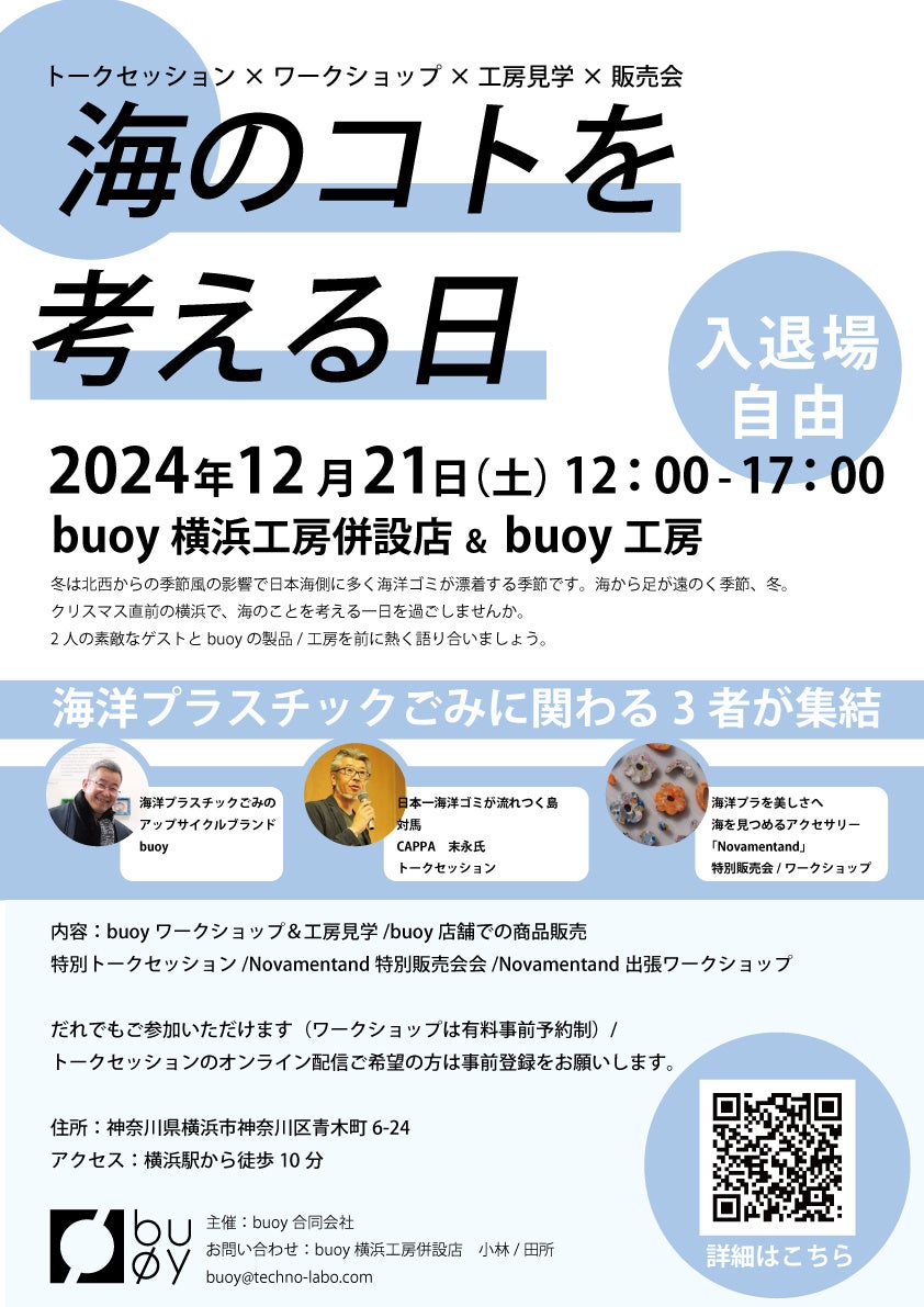 日本一海洋ごみが漂着するとされる島、対馬よりゲストをお迎えし、日本で実際に今起きている問題について話を伺ったり、buoyをはじめ海洋プラを材料にしたアイテムを通し、海と離れた場所で漂着地域のためになにができるのか考えるきっかけを提示します。