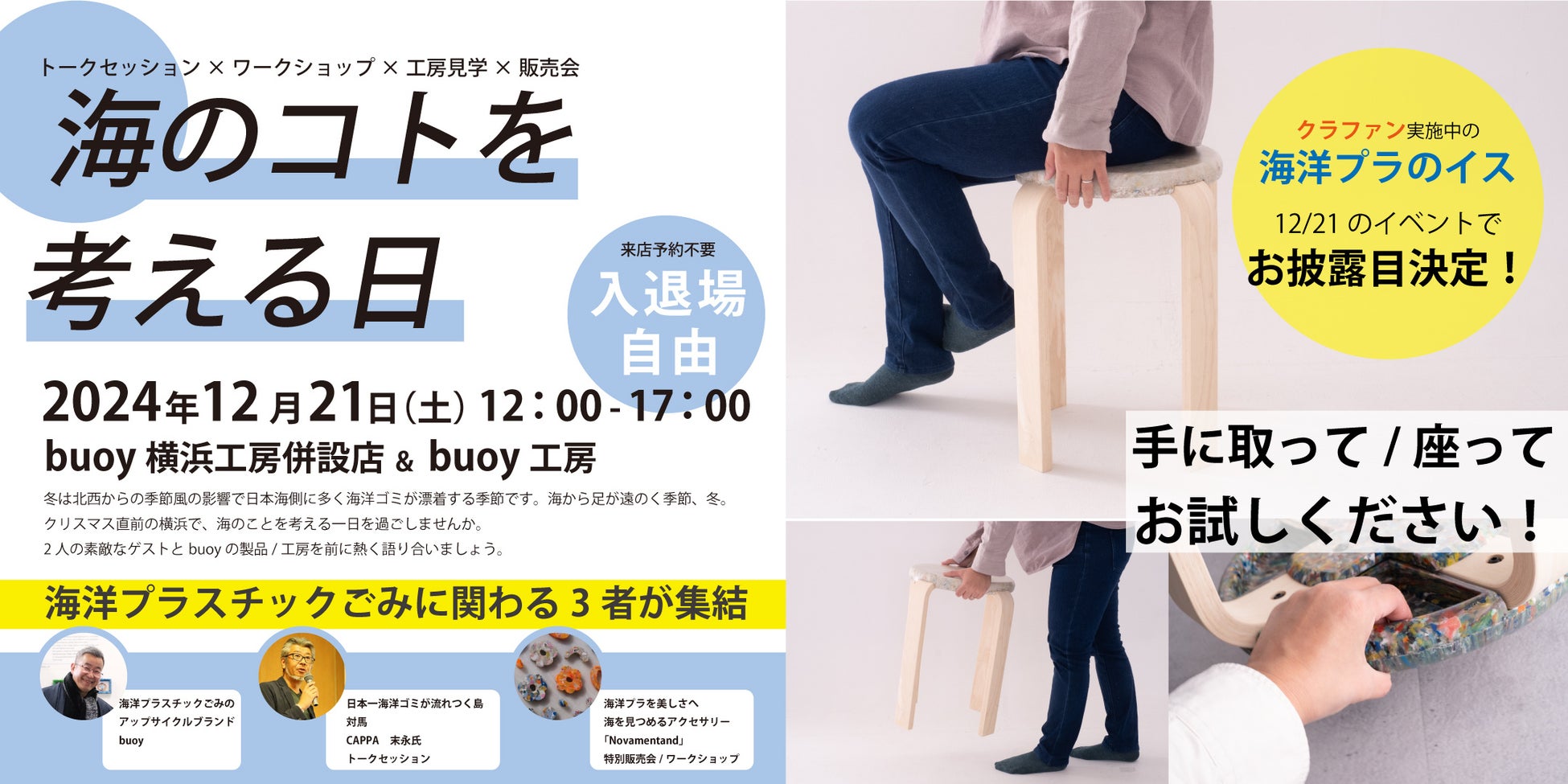 それに伴い、12月21日(土)自社直営店「buoy横浜工房併設店(横浜市神奈川区)」で開催予定のイベント内でスツールをお披露目することが決定しました。代表のミニスピーチ内でスツールの開発経緯を紹介し、実際に商品を手に取ったり試していただける場をご提供いたします。