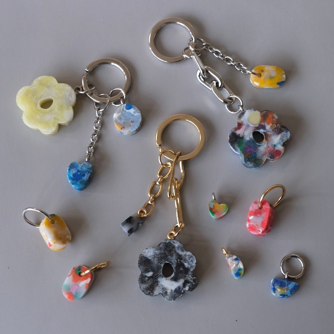 海洋プラスチックごみで出来たチャームを組み合わせてオリジナルのキーホルダーに仕上げます。
