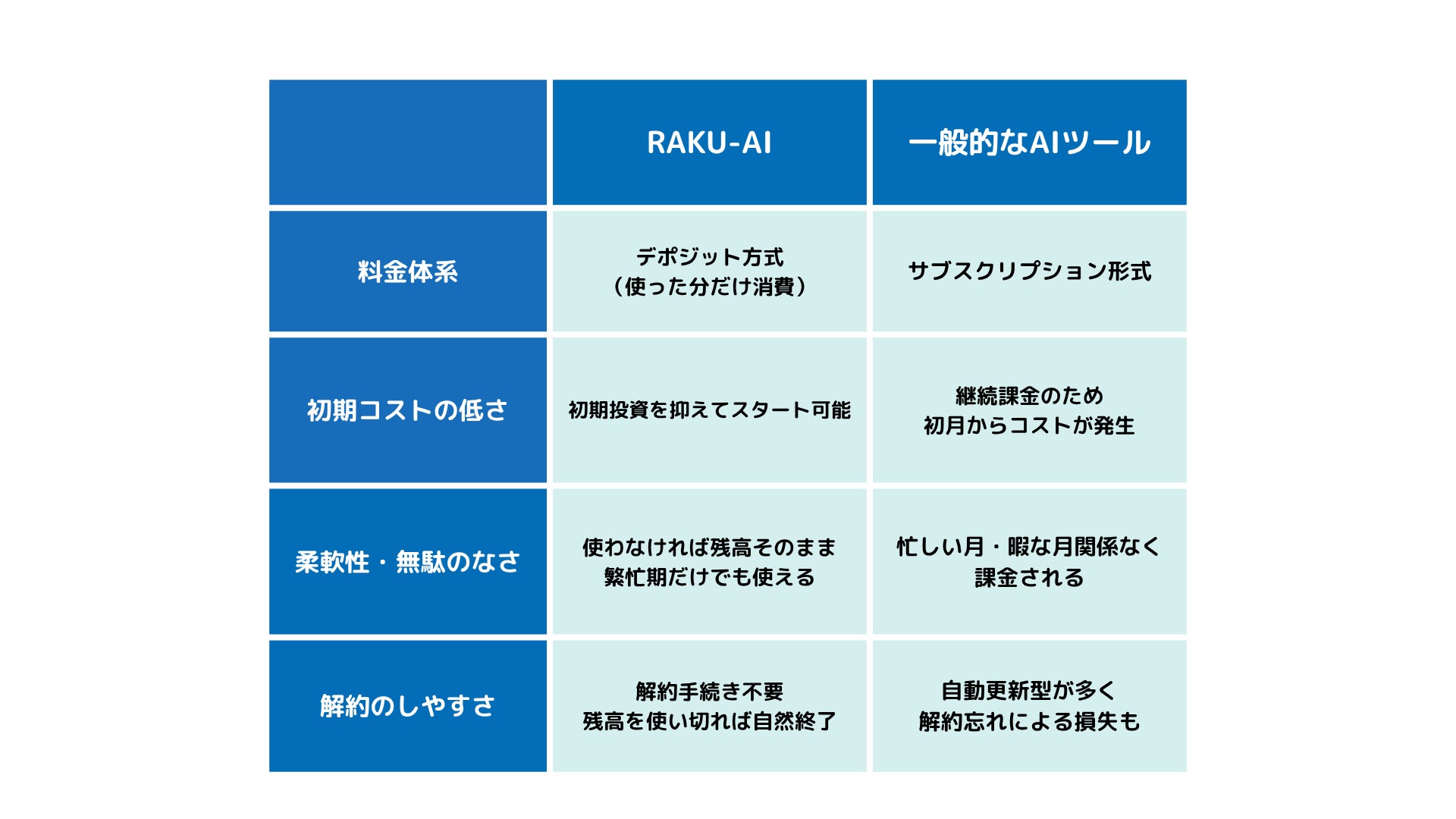 RAKU-AIの料金形態は、月額制(サブスク)ではなくチャージ式(デポジット)を採用しています。