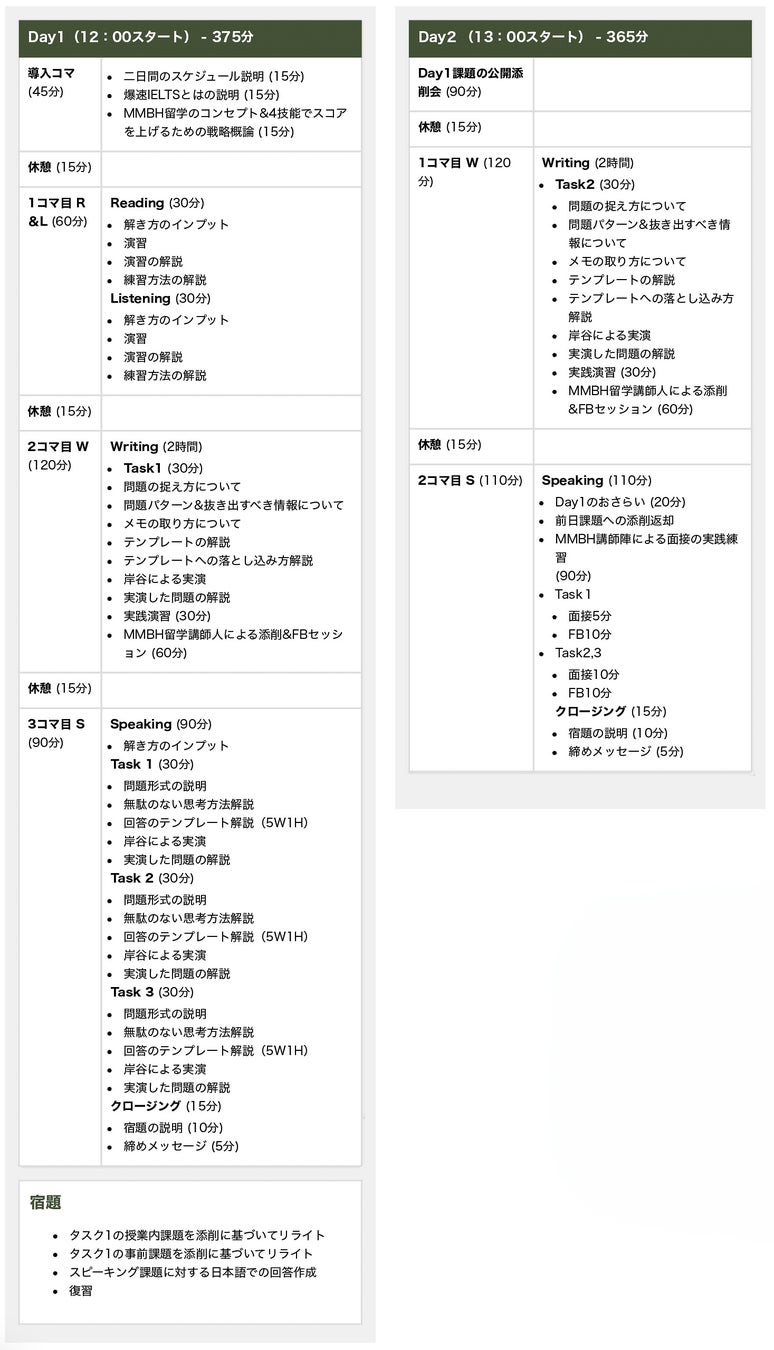 参加料金は2日間で50,000円。この料金には、事前課題と当日課題の即日ライティング添削に加え、IELTS8.0以上保有のMMBH留学講師陣によるスピーキング実践練習と、岸谷からのフィードバックも含まれております。