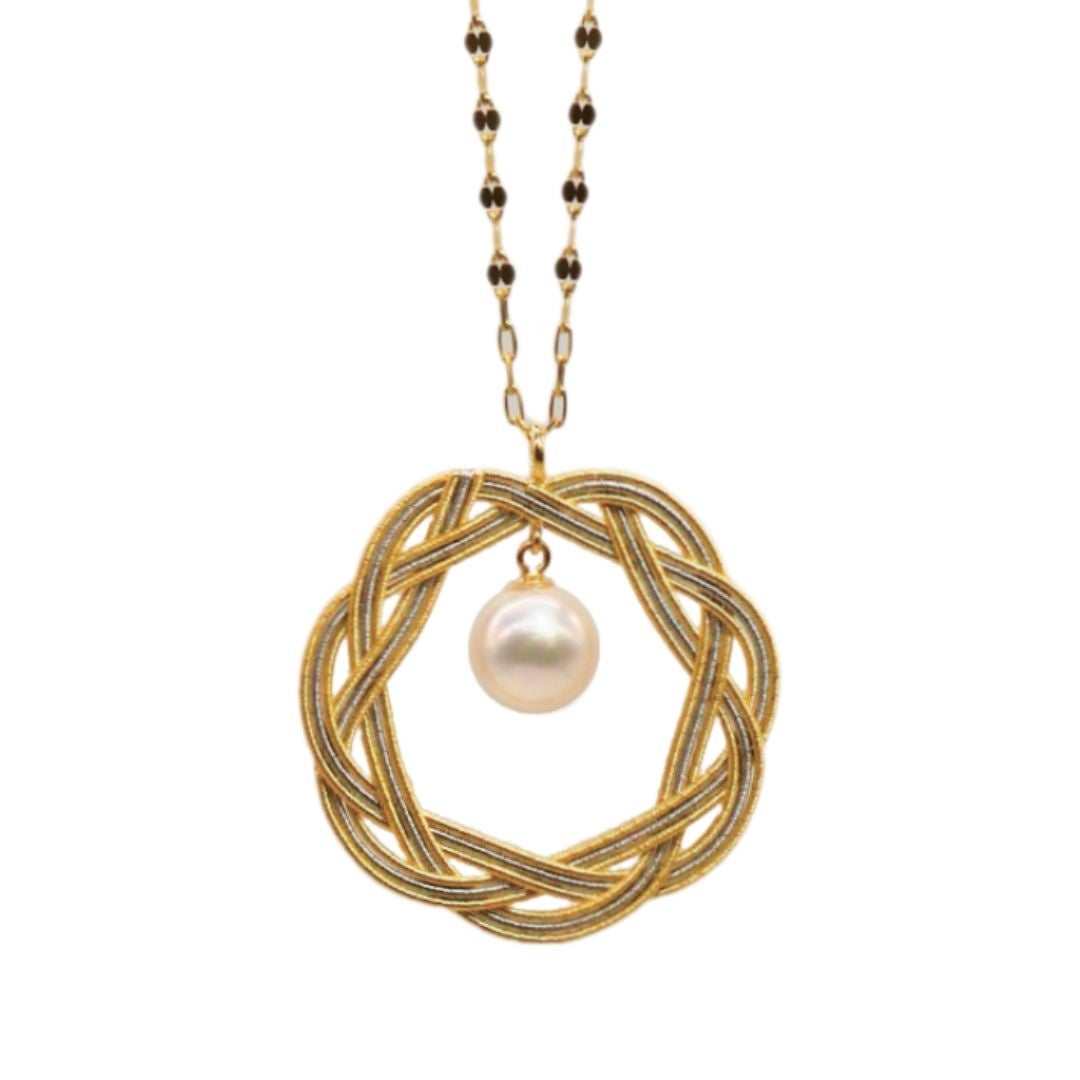 K18とプラチナで仕立てた貴金属水引ジュエリー。使われる素材は0.6mmという水引ではきわめて細いものを丁寧に職人が一つ一つ思いを込めて結んでいます。
