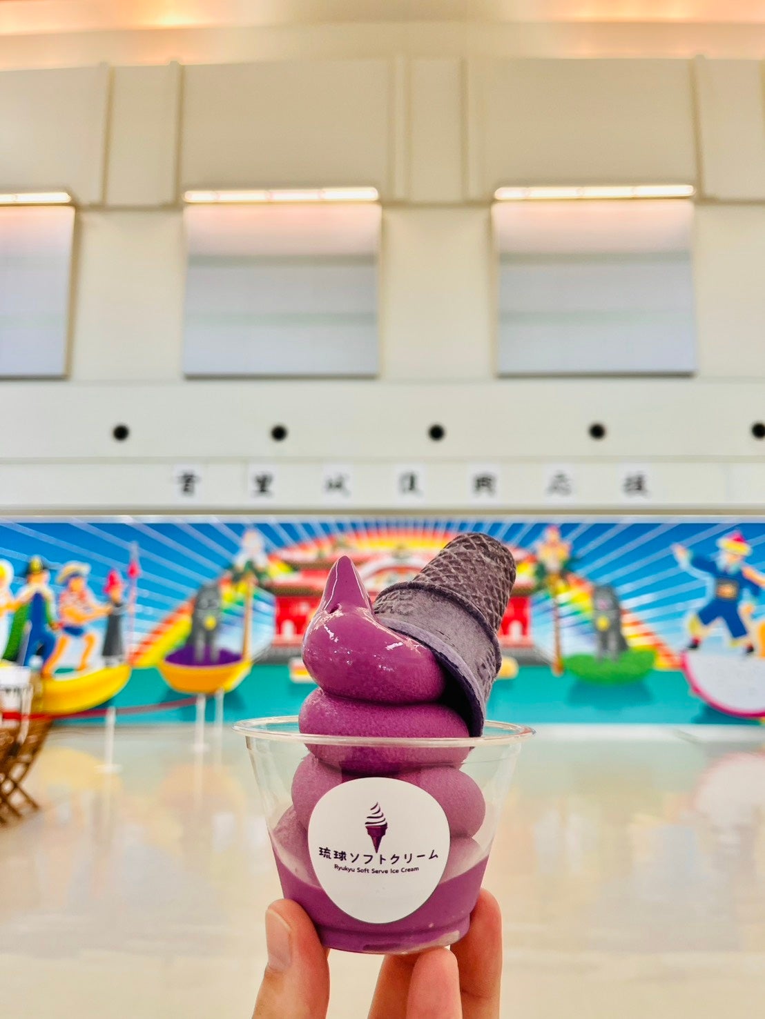 「紅芋をそのまま裏ごししたかのような素朴な味わい」と那覇空港公式SNSでも紹介された、この鮮やかな紫のソフトクリーム。沖縄旅行の余韻を噛みしめながら、出発ゲートへ向かう——そんな旅のシーンを演出します。