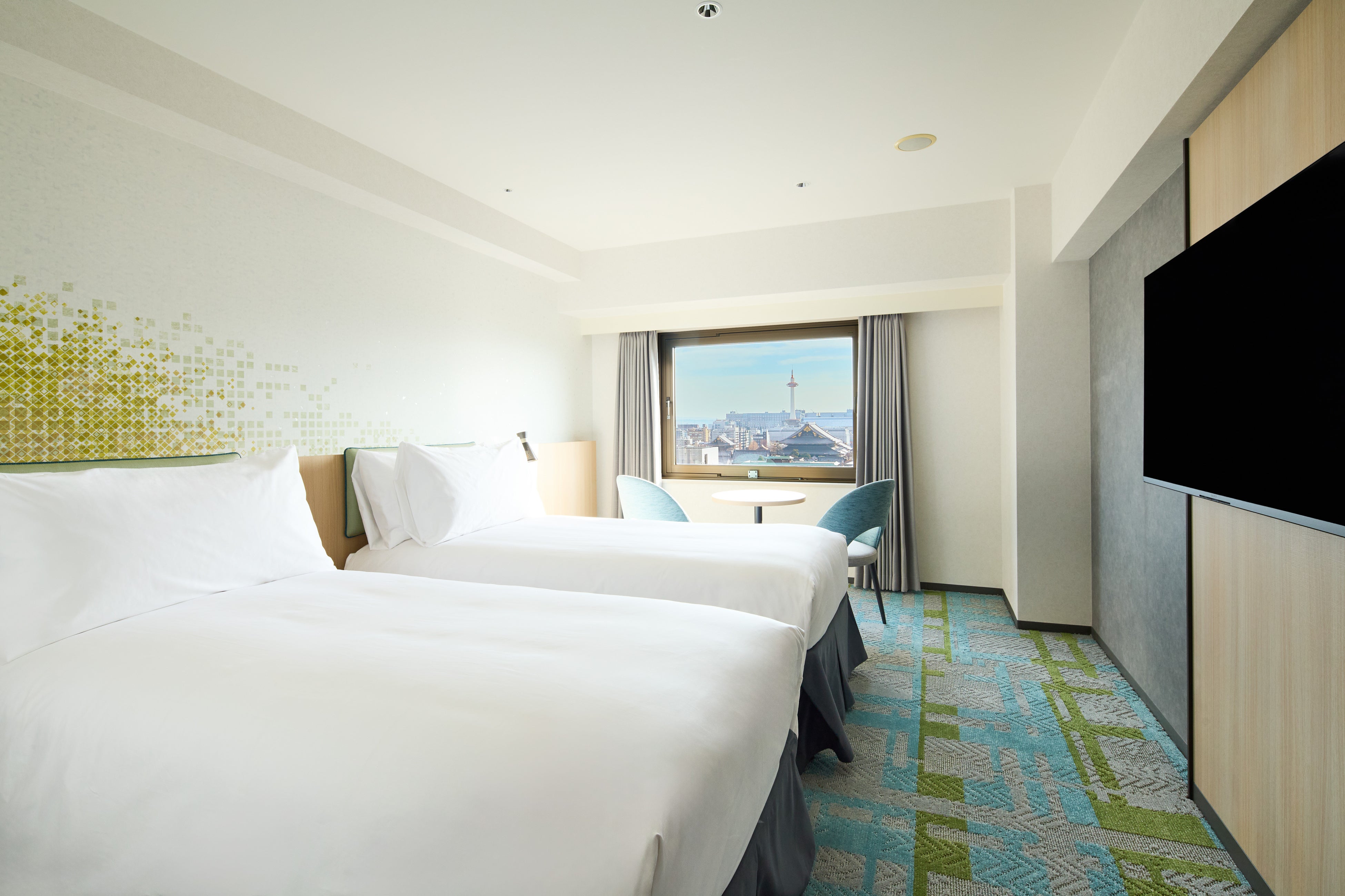 ホリデイ・インを象徴するグリーンを基調に、明るく洗練された色調でまとめられた客室は、細部にまでこだわりました。無料Wi-Fiやスマートテレビを完備し、お好みに合わせて硬さを選べる枕をご用意することで、旅先でもストレスなく快適にお過ごしいただける環境を整えています。高層階の一部の客室からは、京都のシンボルである京都タワーを一望することができ、伝統的な街並みと現代的な景観が織りなす美しい眺望をお楽しみいただけます。朝日に染まるタワーや夜のライトアップされた景色など、時間帯によって異なる魅力を堪能できます。