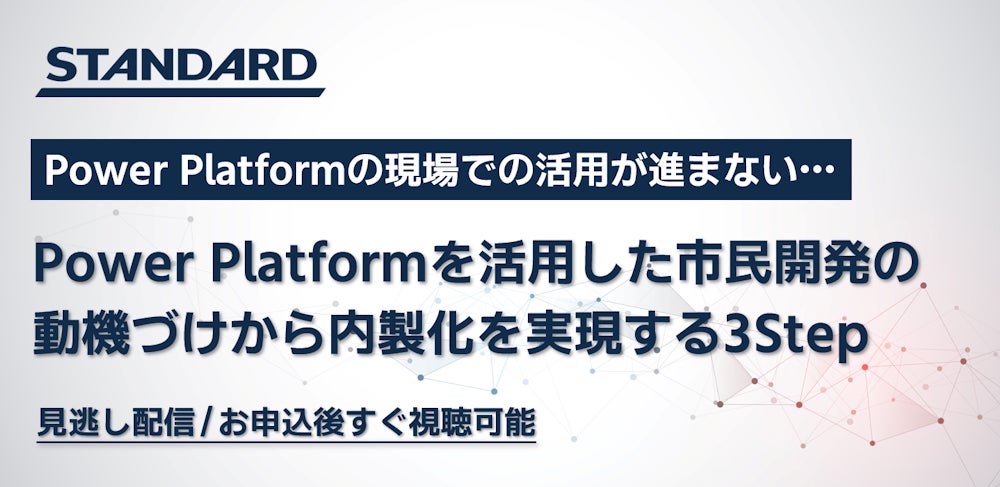大手企業を中心に1,000社以上のデジタルトランスフォーメーション(以下「DX」)の推進と内製化を支援する株式会社STANDARD(本社:東京都港区、代表取締役社長:伊藤海)は、Webセミナー「Power Platformを活用した市民開発の動機づけから内製化を実現する3Step」のアーカイブ動画を無料公開いたしました。