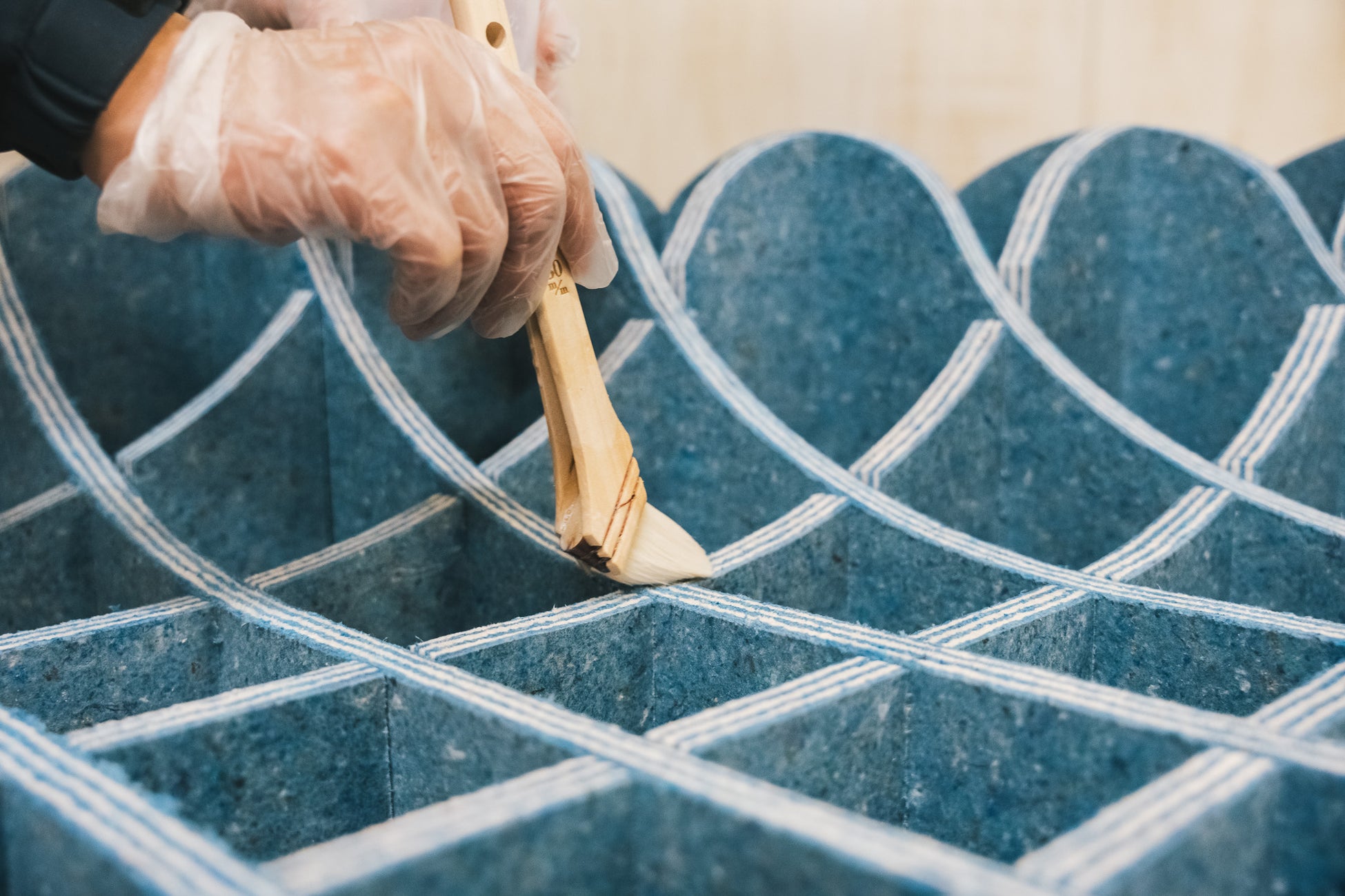 加工はすべて手作業で行い、素材の吸水性を考慮しながら一枚一枚のTEXLAM®︎に「パラヂウムGS」を塗布しました。その後、乾燥や効果の確認まで、細部にわたる品質管理を実施しました。