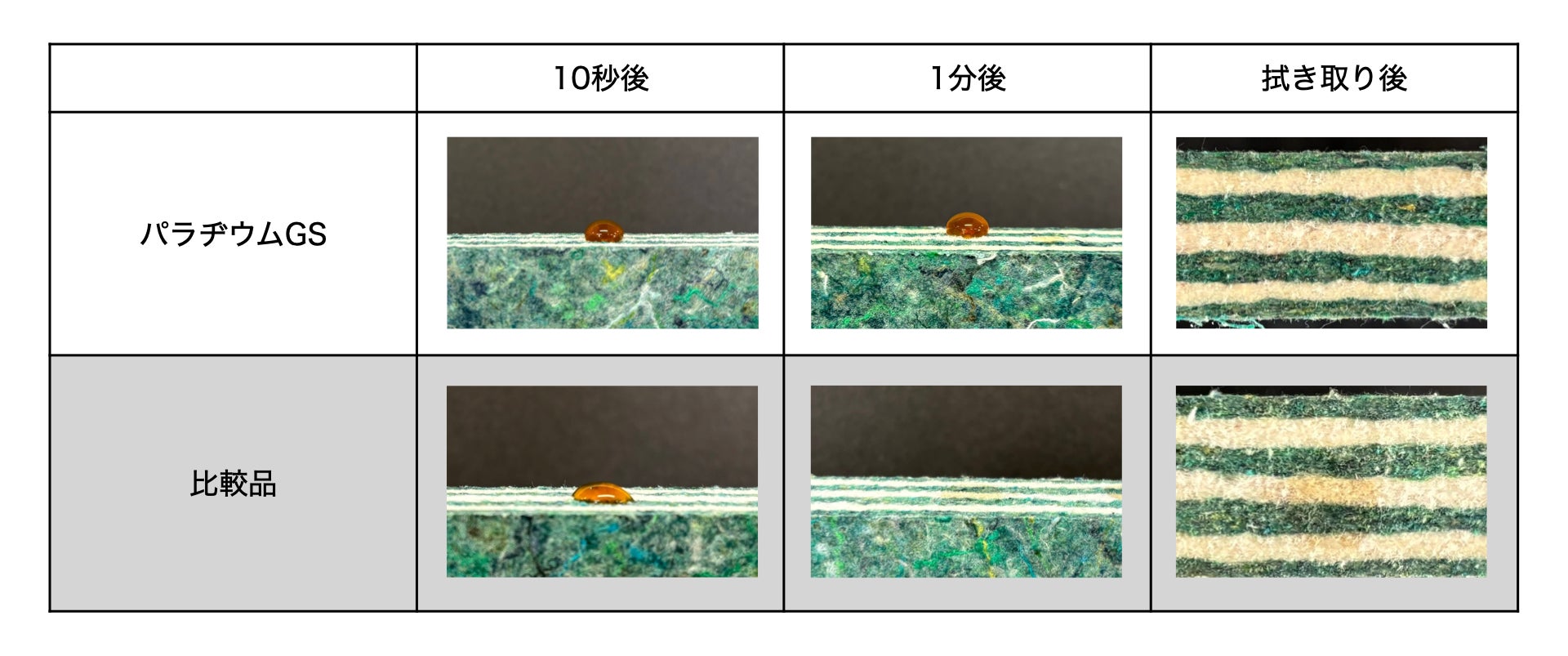 使用した撥水剤は、大原パラヂウム化学が開発・製造する非フッ素系の環境対応型撥水剤「パラヂウムGS」です。優れた撥水性能と環境負荷の少なさを両立しており、衣料品だけでなく、インテリアや建材への応用も期待される注目の技術です。