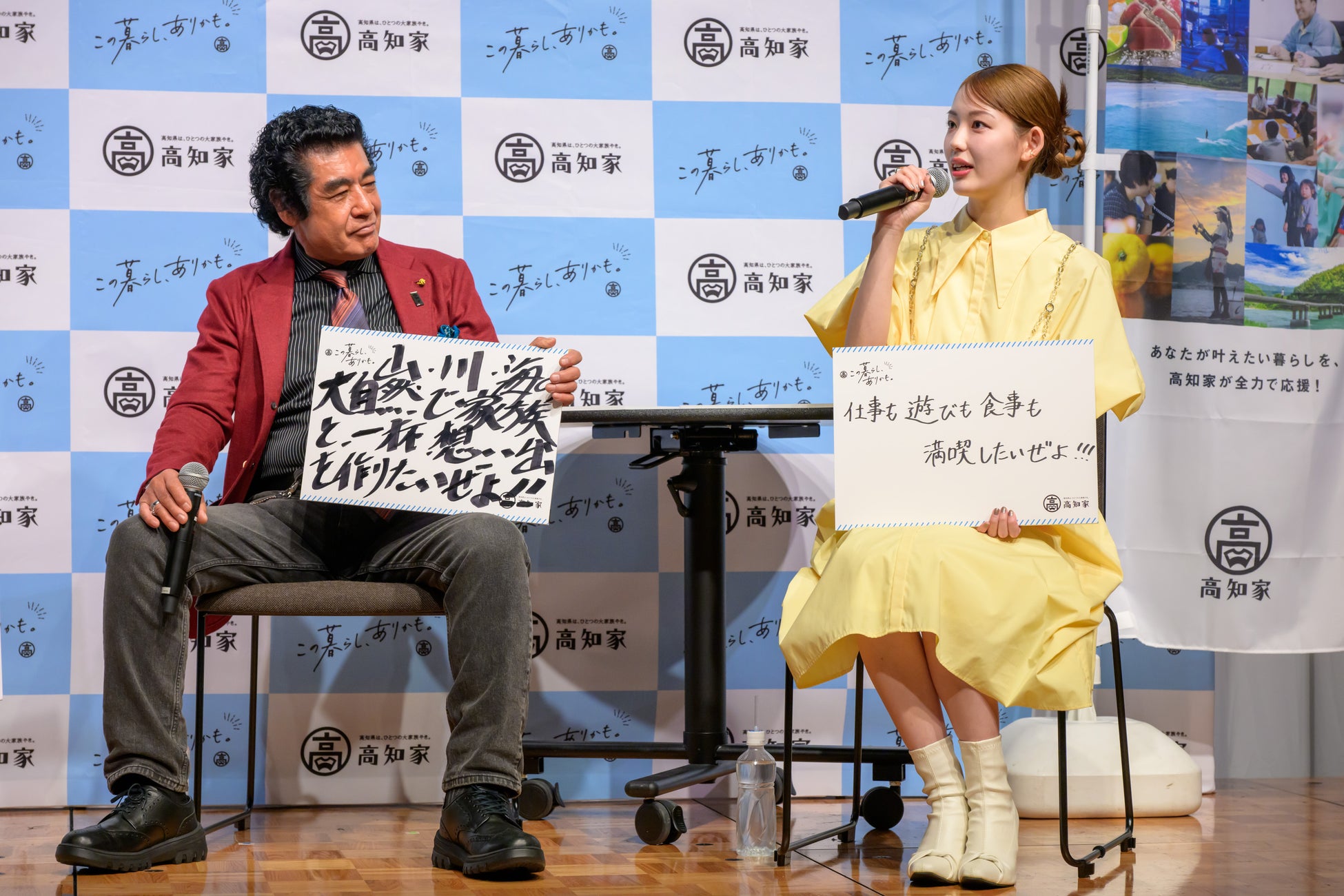 トークセッションの後半では、お二人に「高知に住むならなにしたい?」を土佐弁の「〇〇ぜよ」を使ってお答えいただきました。藤岡さんは「山・川・海の大自然で家族と一杯想い出を作りたいぜよ‼」とご家族との夢を発表。中村さんは「仕事も遊びも食事も満喫したいぜよ‼」と高知県移住に対しての意欲を示しました。さらに「高知県のこれからに期待すること」を聞かれると、藤岡さんは「変身」と回答し、高知県へエールを送りました。中村さんは「女性が活躍する県」と回答し、高知県が推進する女性活躍の制度へ期待を寄せました。藤岡さんの「変身」の回答にちなんで、MCよりご自身のターニングポイントを聞かれると、藤岡さんは「50年前28歳の時に演じた坂本龍馬です。これが僕にとって本当に変身したことの1つでした。30歳前後は人生の大きなターニングポイントを選択する人が多いのではないかと。もし高知にUターン移住を選択する人がいたら応援したいですし、もし娘息子がそのような話をしてきたら積極的におすすめしたいと思います。日本も変身せないかんぜよ、地方も変身せないかんぜよ、時は今です!」とUターンを検討する人へエールを送りました。中村さんは「昨年らんまんに出演させていただいたことです。そこから高知のお仕事やイベントなど発信する場にたくさん出させていただいて、地元高知の魅力をすごく感じた一年で、その魅力をたくさんの人にもっと広めていきたいなと思いました。」とそれぞれのターニングポイントをお話しいただきました。中村さんのコメントに藤岡さんは思わず「中村さんには「はちきん」を感じますね。」と感激していました。