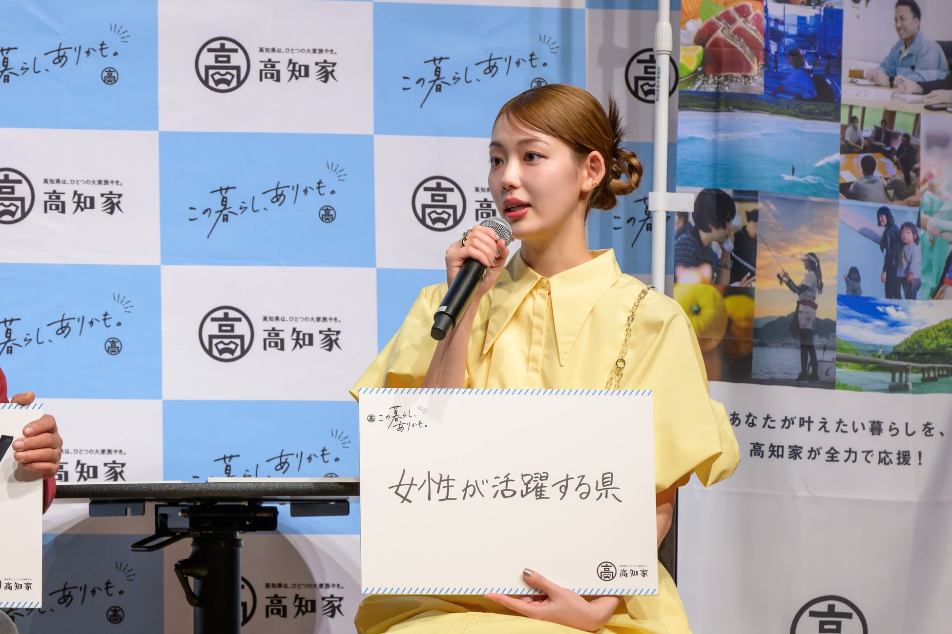 発表会では、高知県が新しく作成したキャッチコピー「この暮らし、ありかも。」が発表され、実際にUIターンをして活躍している方が登場するPR動画とポスターをお披露目しました。PR動画の感想を聞かれると、藤岡さんは「特に女性が元気に活躍している姿が入っていていいなと思いました。自然豊かな海、川、山の中でのびのびと生きている活発な女性像が見えて、いいですね。あとは男性が育児をやっている映像が良いイメージになりました。」と感想を述べ、中村さんは「魚や野菜など、高知の食材を食べるとエネルギーが湧く感じがあって、そういったエネルギーがVTRにもすごく出ているなと思いました。このVTRを見て、この暮らしありかもっていう風に思ってくれる方はたくさんいるんじゃないかなと思いました。」と高知県への印象を語りました。お二人からのコメントを受け濵田知事は「本当にありがとうございます。今回の動画を作るにあたって、どうやったらUターンIターンが増えるだろうかと高知県内の若者と話し合いをしました。そして元気に楽しそうに暮らしている若者の姿を多くの人に見てもらったら、自然と増えるんじゃないですかという意見があり、それ採用!ということで今回のこの動画を作りました。」とPR動画に関して熱い想いを語りました。