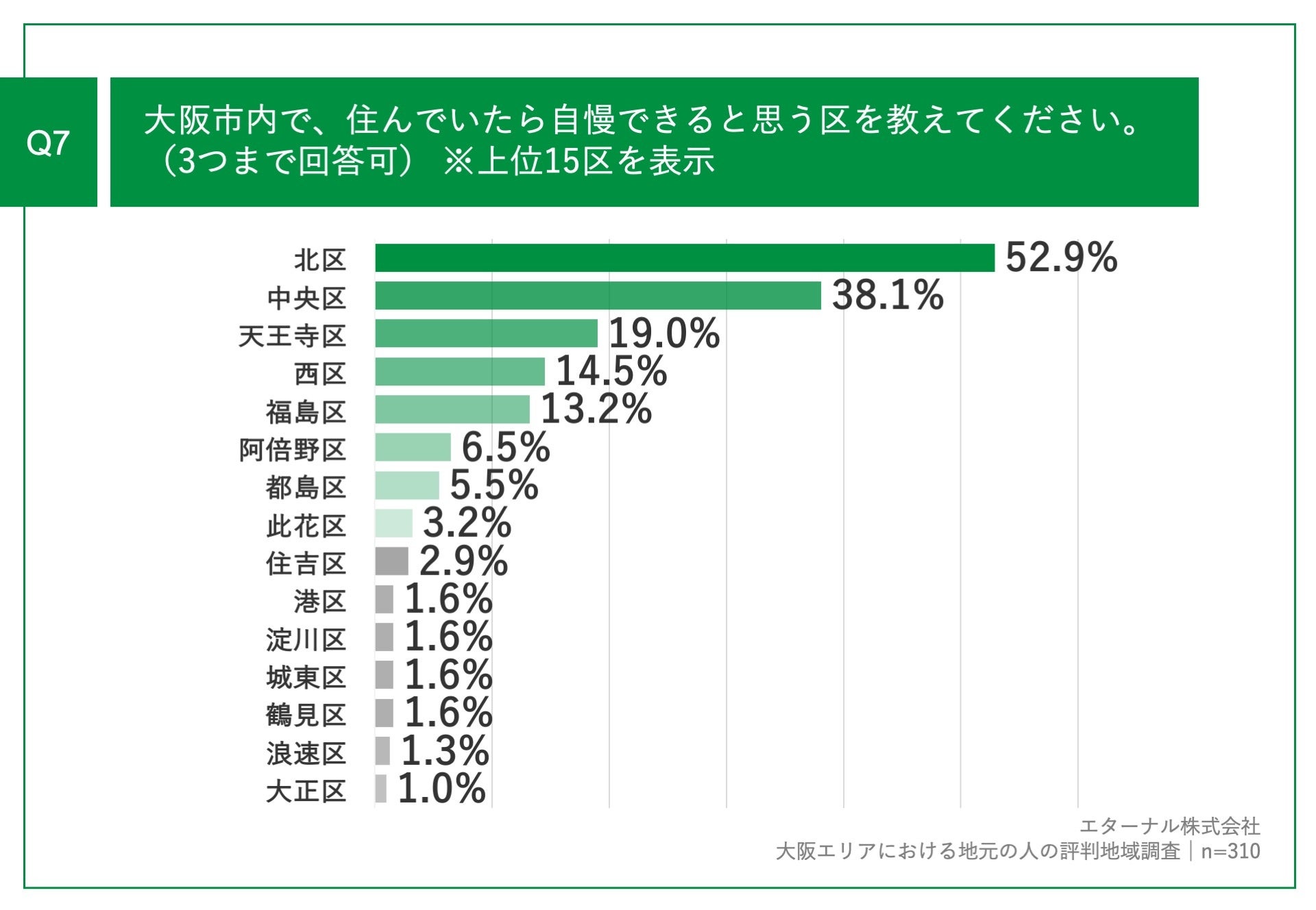 「Q7.大阪市内で、住んでいたら自慢できると思う区を教えてください。(3つまで回答可)」(n=310)と質問したところ、「北区」が52.9%、「中央区」が38.1%、「天王寺区」が19.0%という回答となりました。