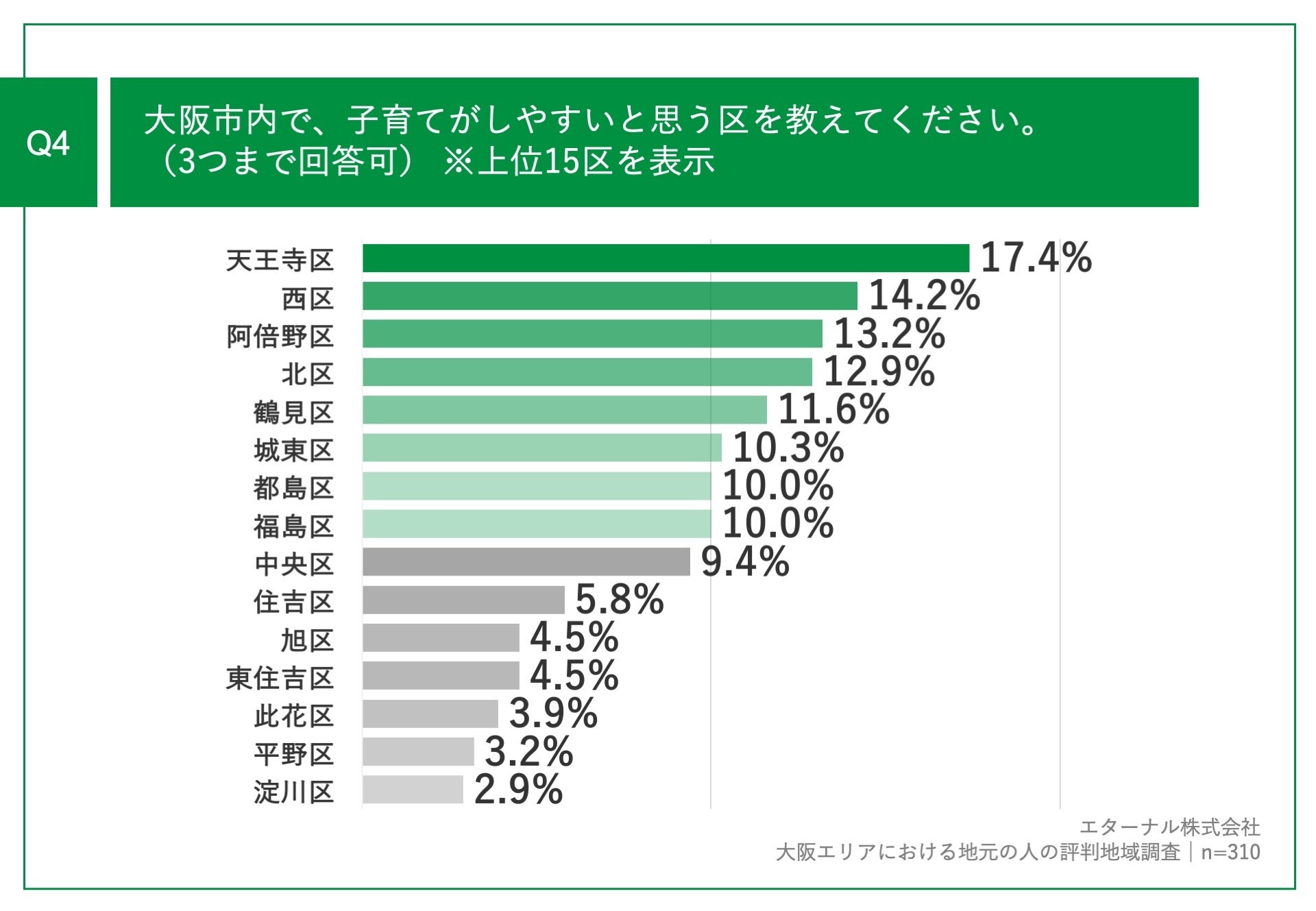 「Q4.大阪市内で、子育てがしやすいと思う区を教えてください。(3つまで回答可)」(n=310)と質問したところ、「天王寺区」が17.4%、「西区」が14.2%、「阿倍野区」が13.2%という回答となりました。