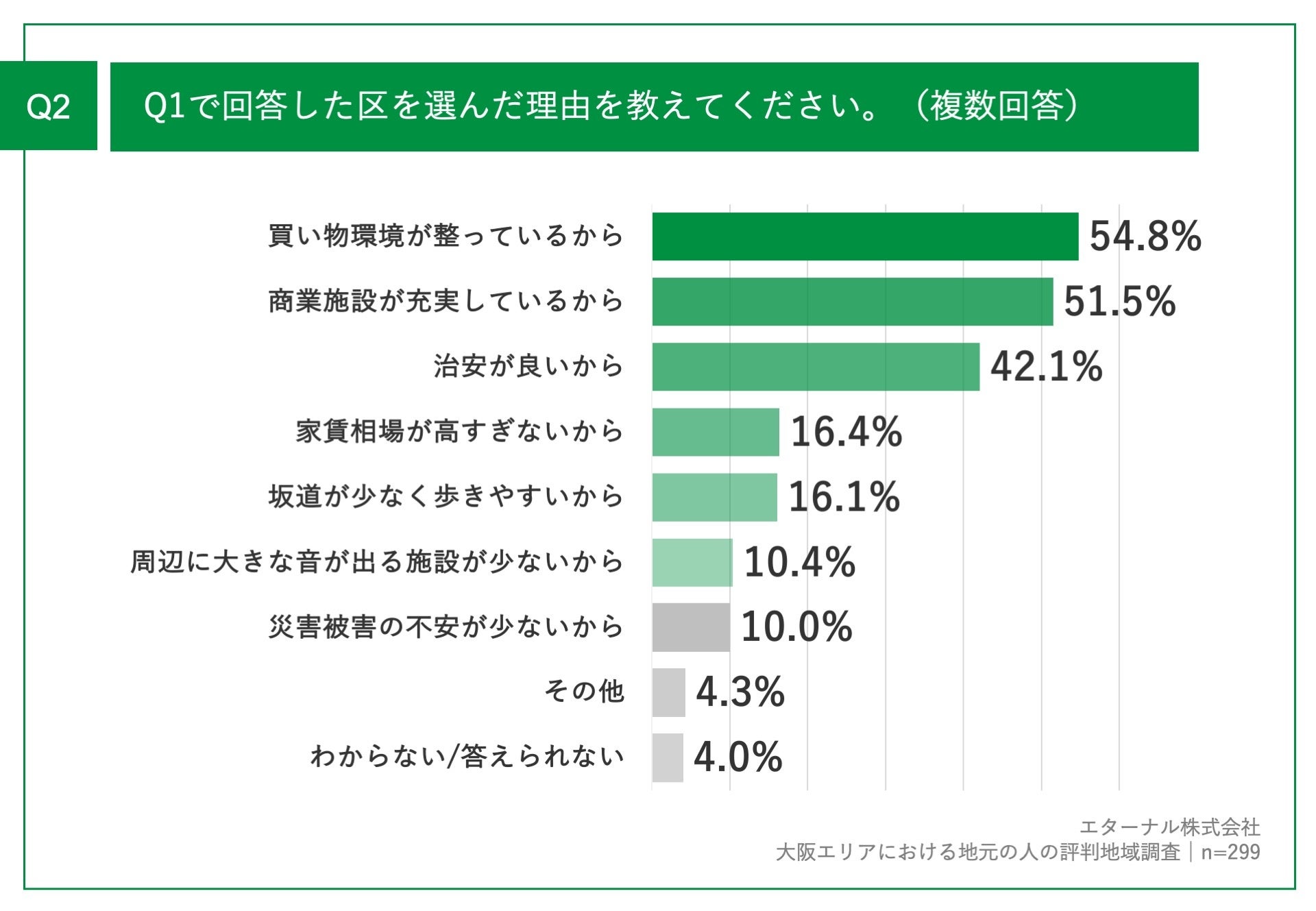 Q1で「あてはまるものはない/わからない」以外を回答した方に、「Q2.Q1で回答した区を選んだ理由を教えてください。(複数回答)」(n=299)と質問したところ、「買い物環境が整っているから」が54.8%、「商業施設が充実しているから」が51.5%、「治安が良いから」が42.1%という回答となりました。