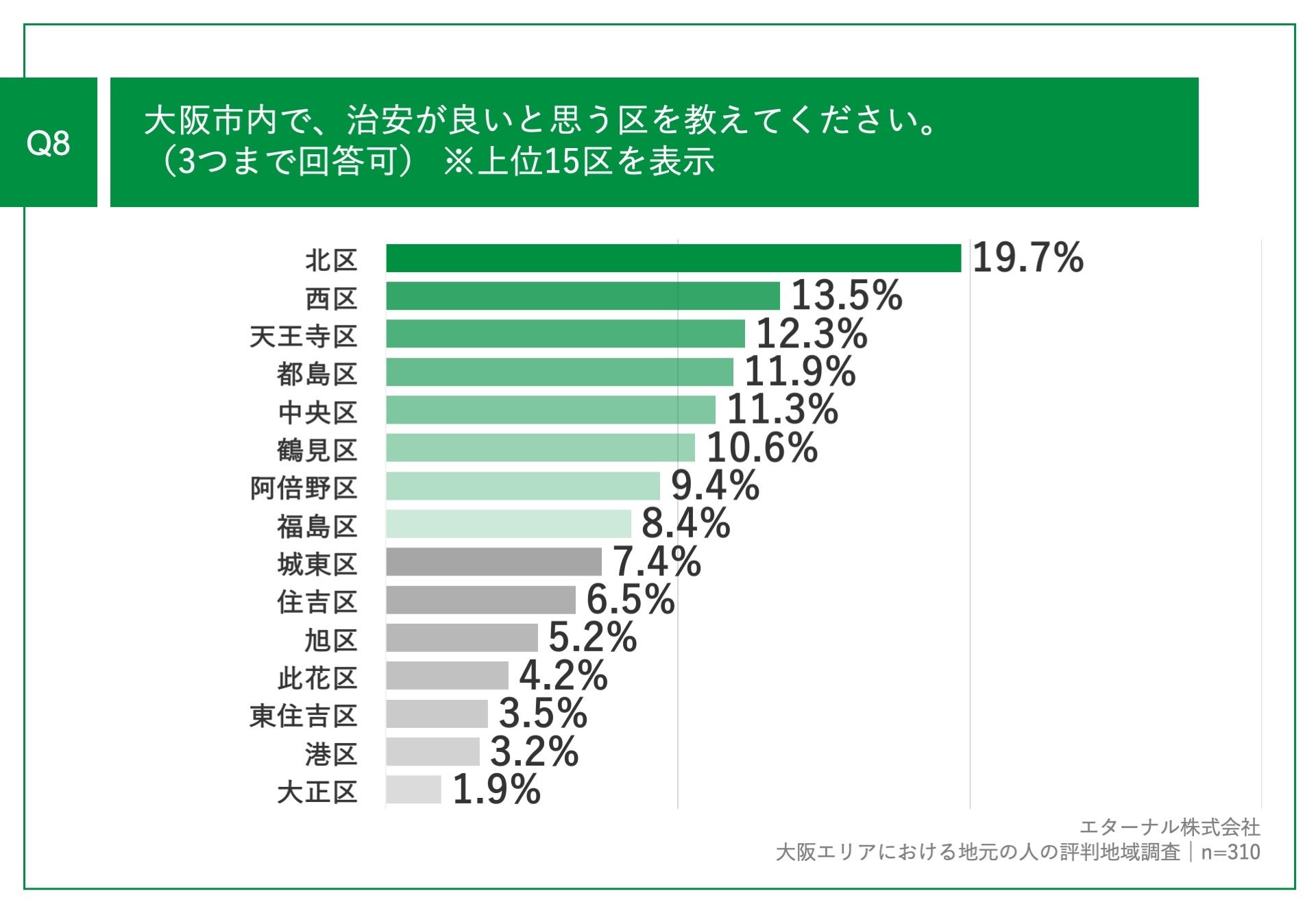 「Q8.大阪市内で、治安が良いと思う区を教えてください。(3つまで回答可)」(n=310)と質問したところ、「北区」が19.7%、「西区」が13.5%、「天王寺区」が12.0%という回答となりました。
