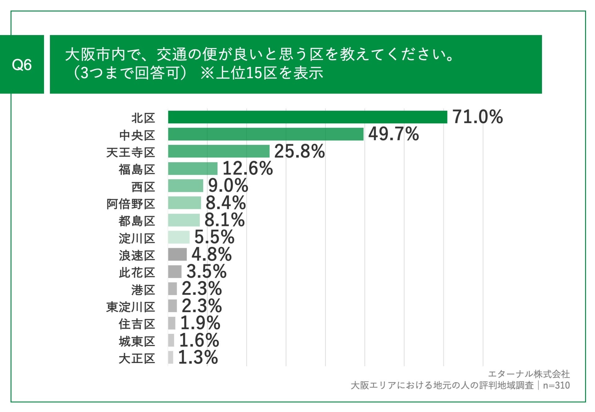 「Q1.大阪市内で、総合的な住みやすさの観点で評価が高いと思う区を教えてください。(3つまで回答可)」(n=310)と質問したところ、「北区」が25.8%、「天王寺区」が19.4%、「中央区」が18.7%という回答となりました。