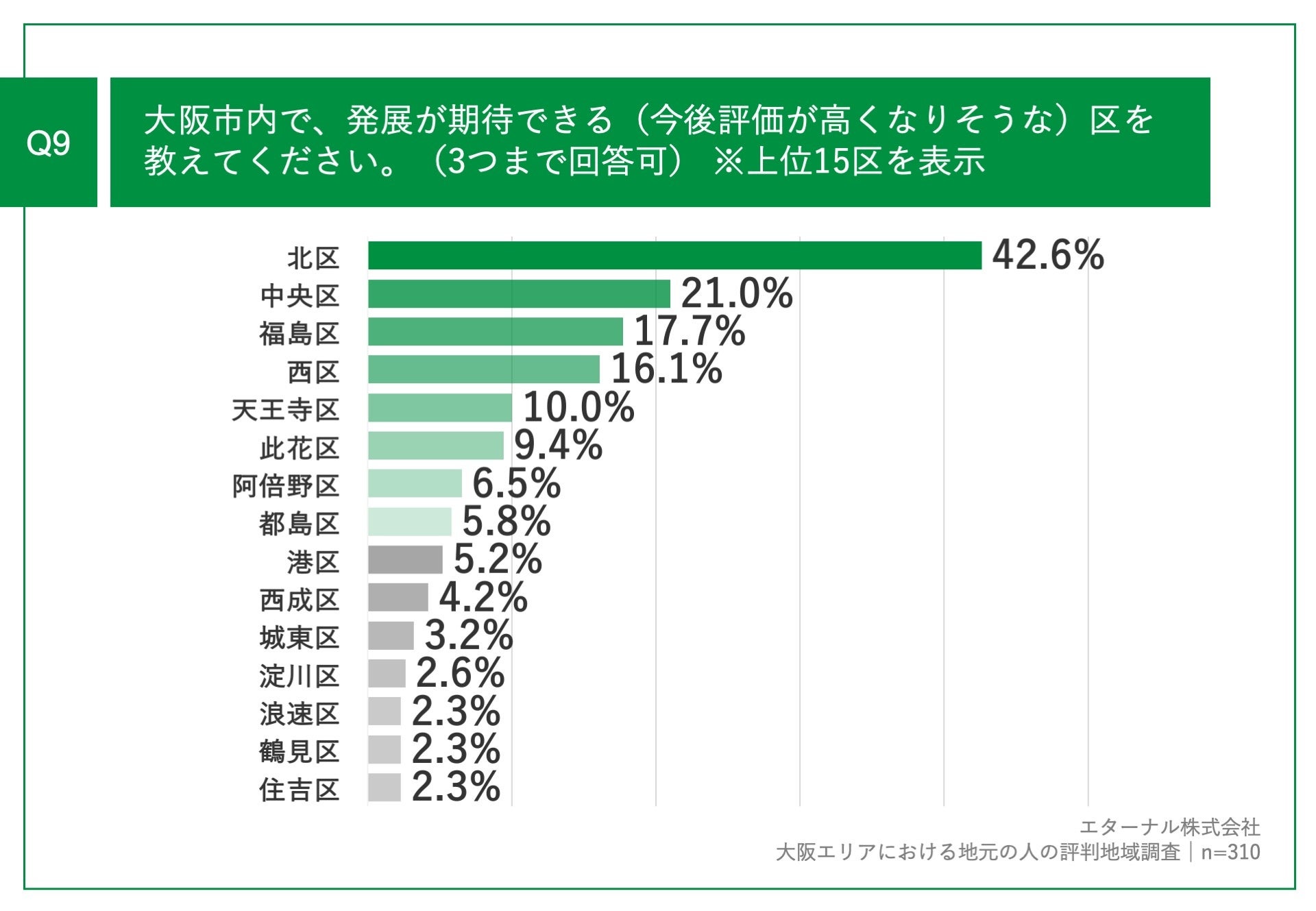 「Q9.大阪市内で、発展が期待できる(今後評価が高くなりそうな)区を教えてください。(3つまで回答可)」(n=310)と質問したところ、「北区」が42.6%、「中央区」が21.0%、「西区」が16.1%という回答となりました。