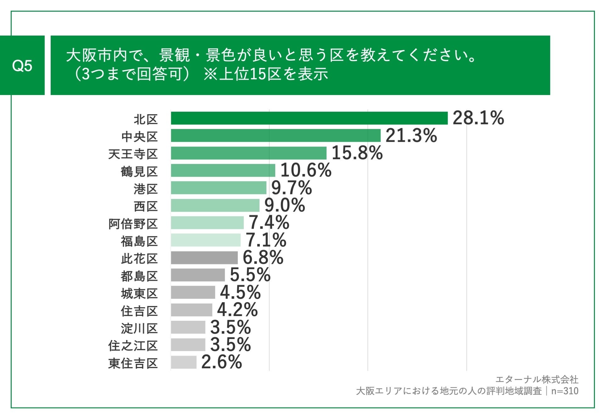「Q5.大阪市内で、景観・景色が良いと思う区を教えてください。(3つまで回答可)」(n=310)と質問したところ、「北区」が28.1%、「中央区」が21.3%、「天王寺区」が15.8%という回答となりました。