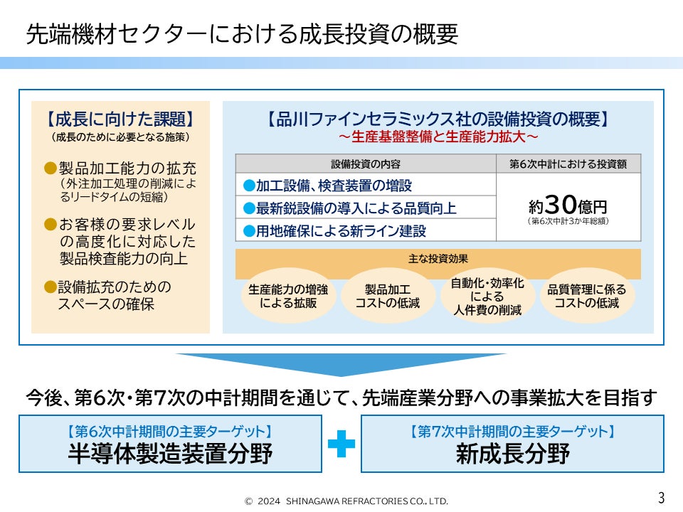 第 6 次中期経営計画期間(2024~2026 年度)では半導体製造装置関連市場における成長を目標とします。 さらに次期となる第 7 次中期経営計画(2027~2030 年度)では、今回の投資により整備された生産基盤をベースにさらなる成長投資を行うことによって、品川リフラクトリーズグループが新成長分野と位置付けている航空宇宙・エネルギー関連分野などへの本格参入を目指します。 具体的な例としては「航空機部材用 特殊蒸着材」、「リチウムイオン電池などの 電池製造関連製品」 などであり、現在は需要の捕捉に向けて市場調査、製品開発を進めています。