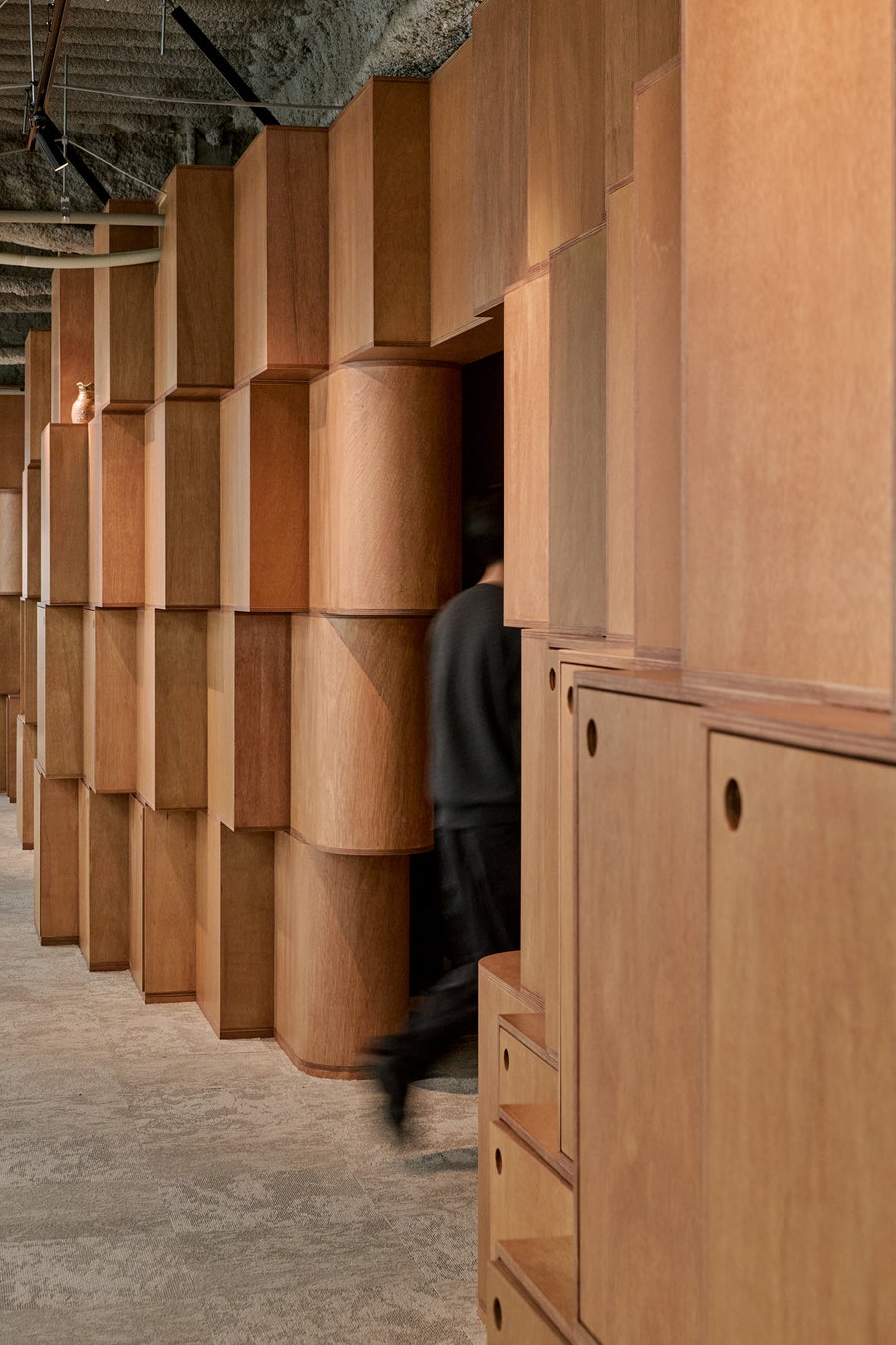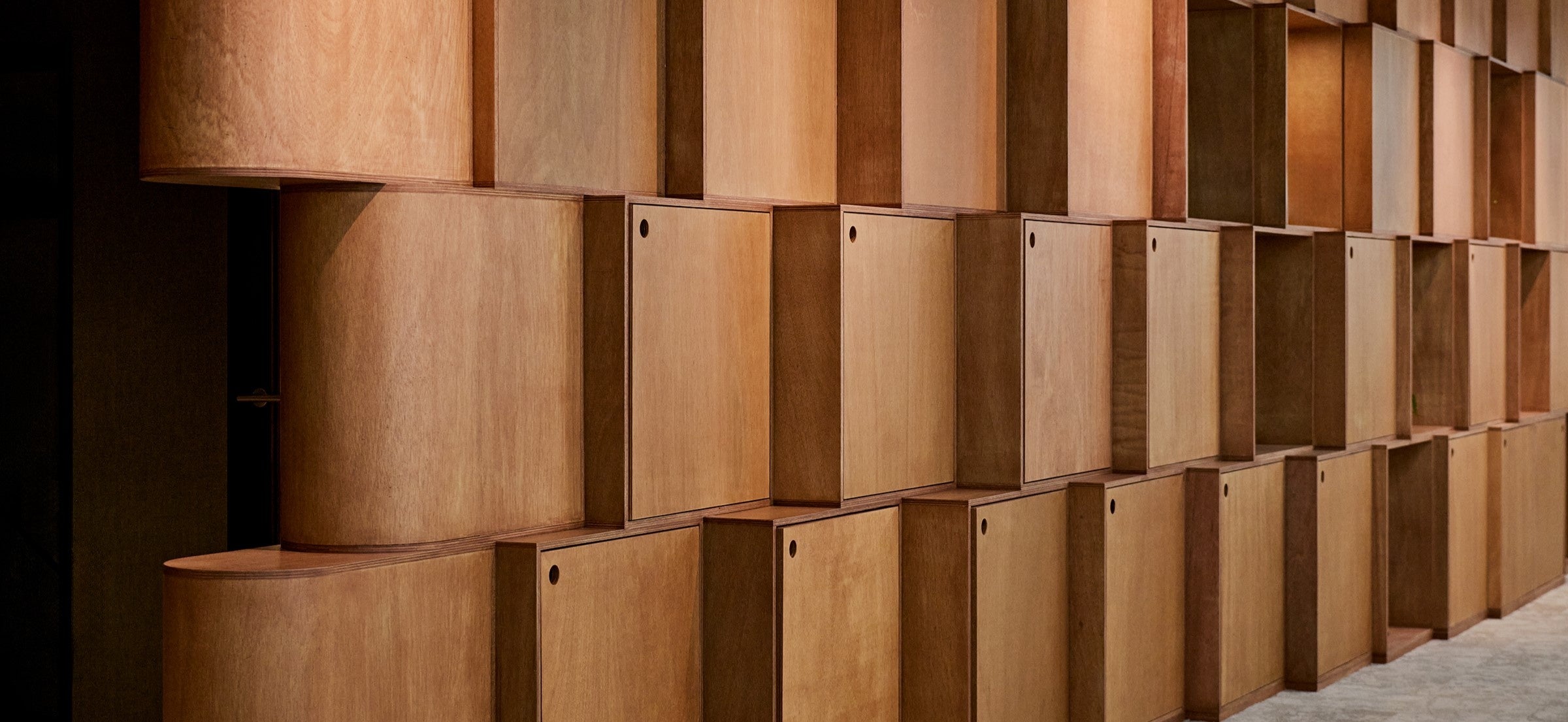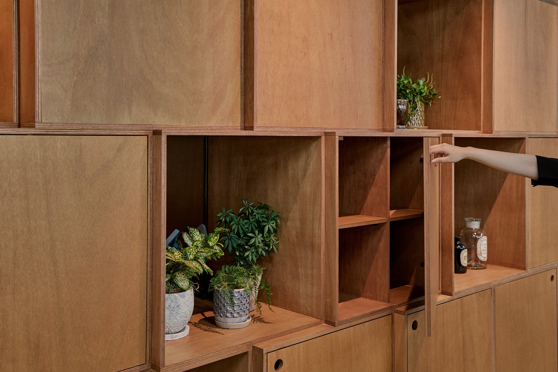 ディプティックが取り組んできたサステナブルな思想は、本プロジェクトにおいても重要な指針です。木箱にはラワン材を使用。どちらかというと目に見える部分では使用されてこなかった木材を空間の主役として活用。資源の最大価値化を図り、カーボンニュートラルに貢献しながら空間全体にやわらかな印象を生みだしています。また、木目や色味の個体差を素材の持つ微妙に異なる表情と捉えなおし、空間に豊かな奥行きをもたらしています。そして、木箱同士の接合を工夫し、リユースが最大限可能となる計画にしています。