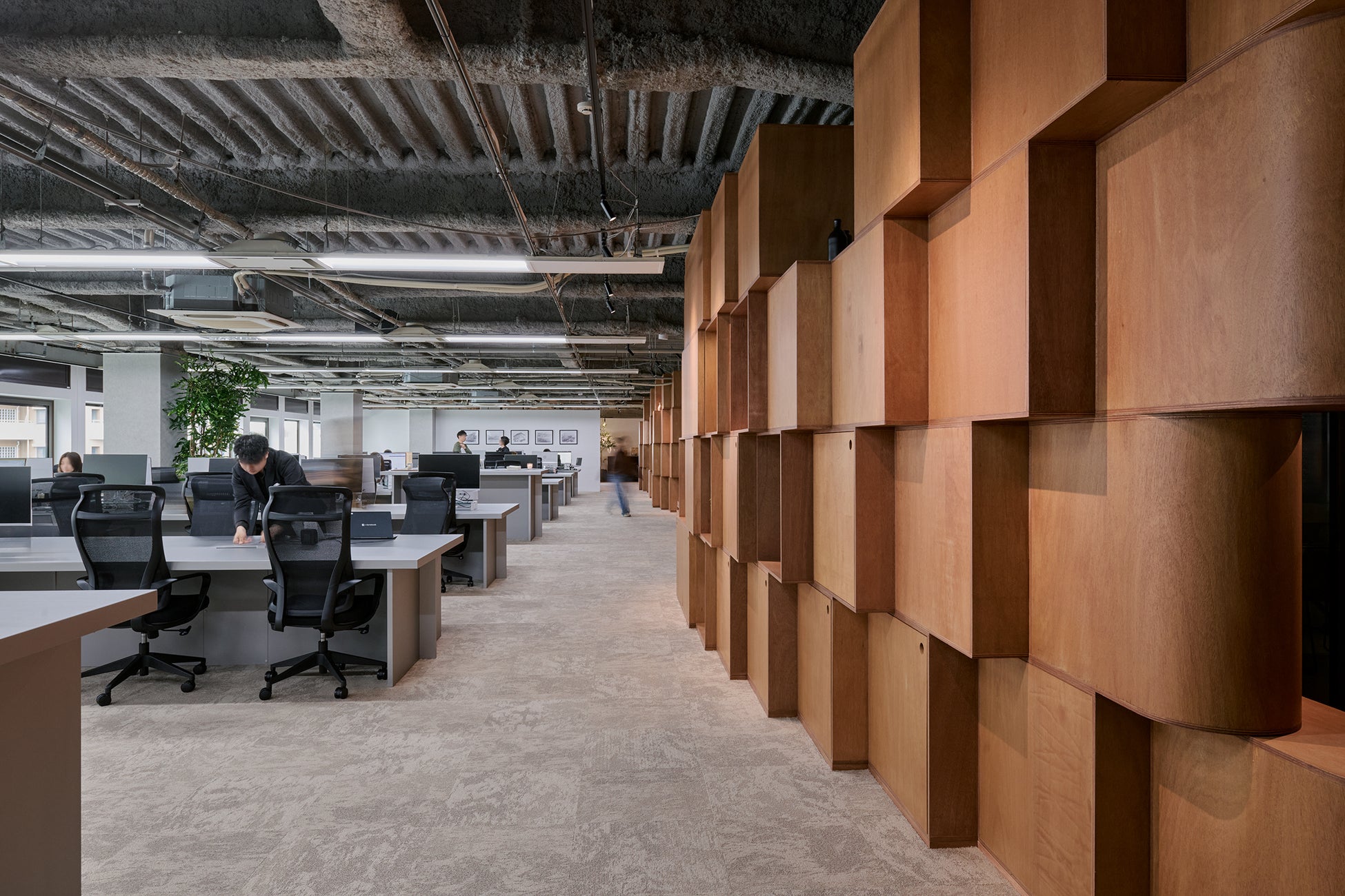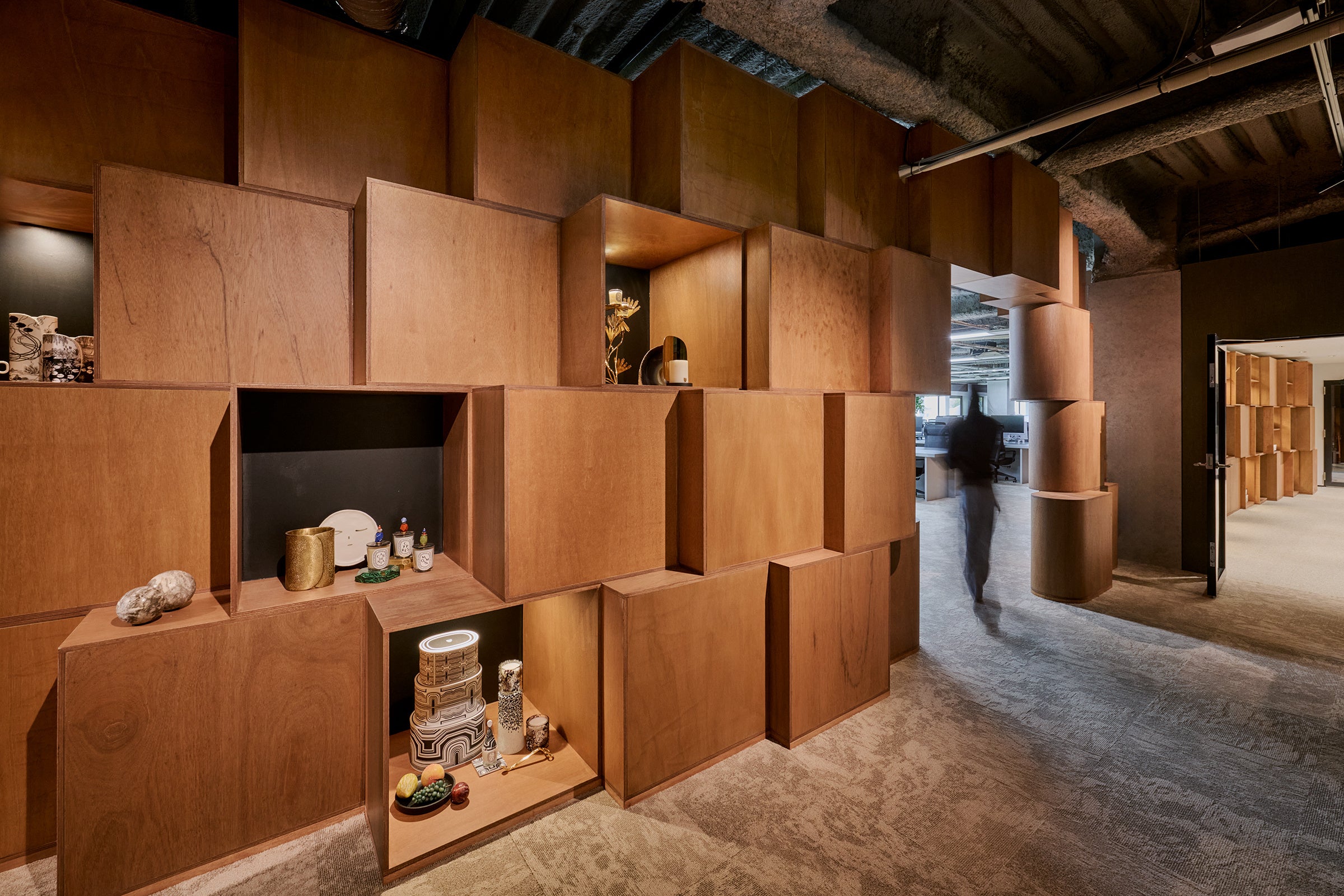 執務エリアとミーティングエリアのあいだに横たわる長い壁面。これをただの分節線ではなく、木箱が有機的に集合するインターフェイスとして再構築しました。商品の、ドキュメントの、そしてアイディアのストックヤード。Diptyqueの積み重ねてきた歴史を表象するオブジェクトが、スタッフの創造性を触発し、やわらかな境界を描き出します。