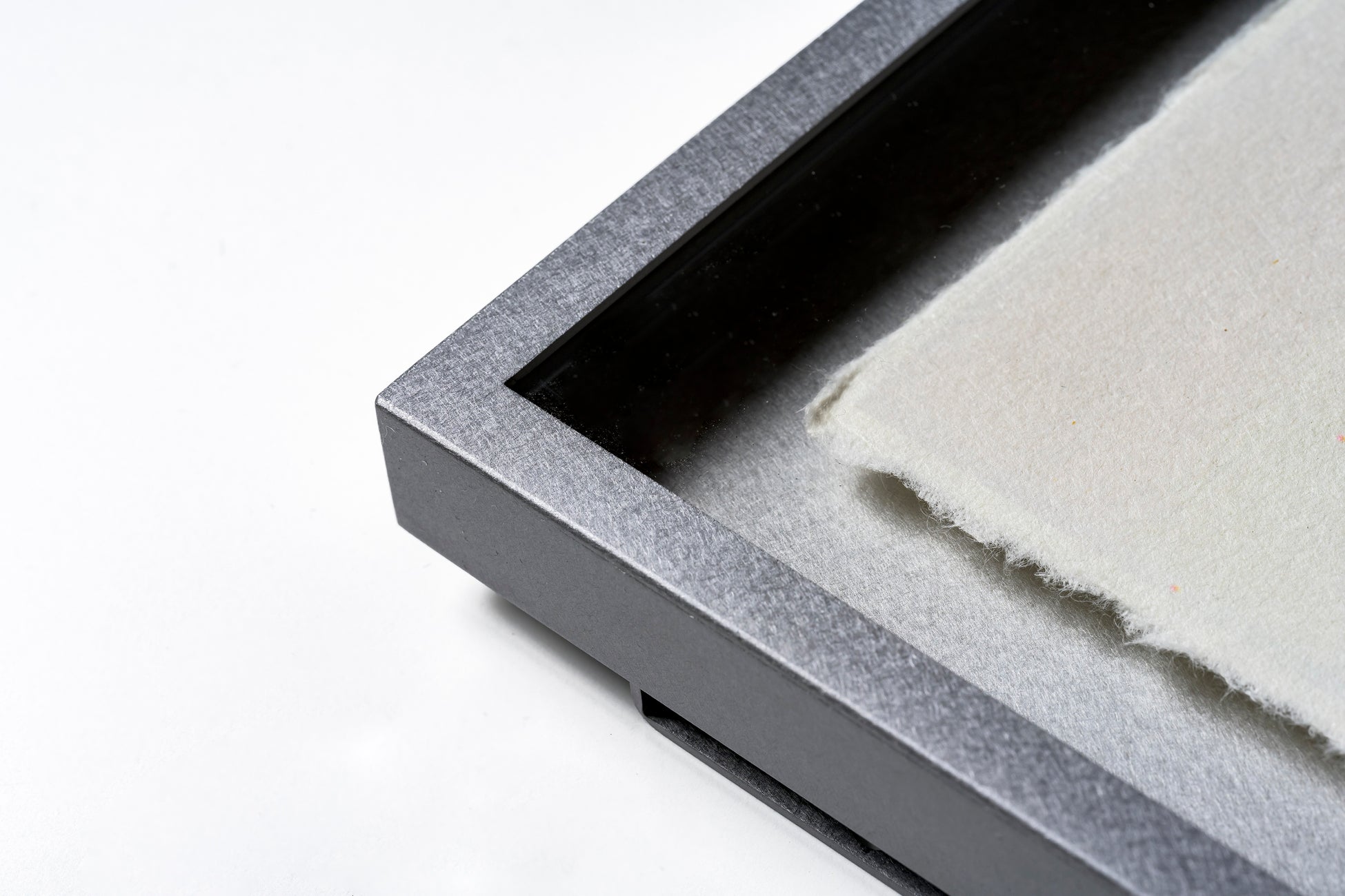 群馬県伊勢崎市を拠点に、精緻な金属加工品の制作を行っている。今回の作品の鉄製フレームは、一枚の鉄板に窓を開け、側面に鉄の板を溶接して制作。貼り合わせの隙間や溶接による歪みは一切なく、極めて高い平面性と美しい質感のシンプルなフレームとして完成させた。シンプルな物を完成度高く作るという難しい命題を見事に実現している。