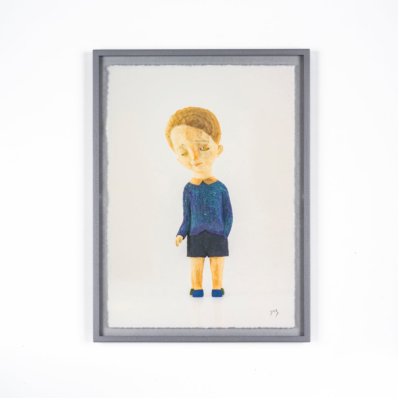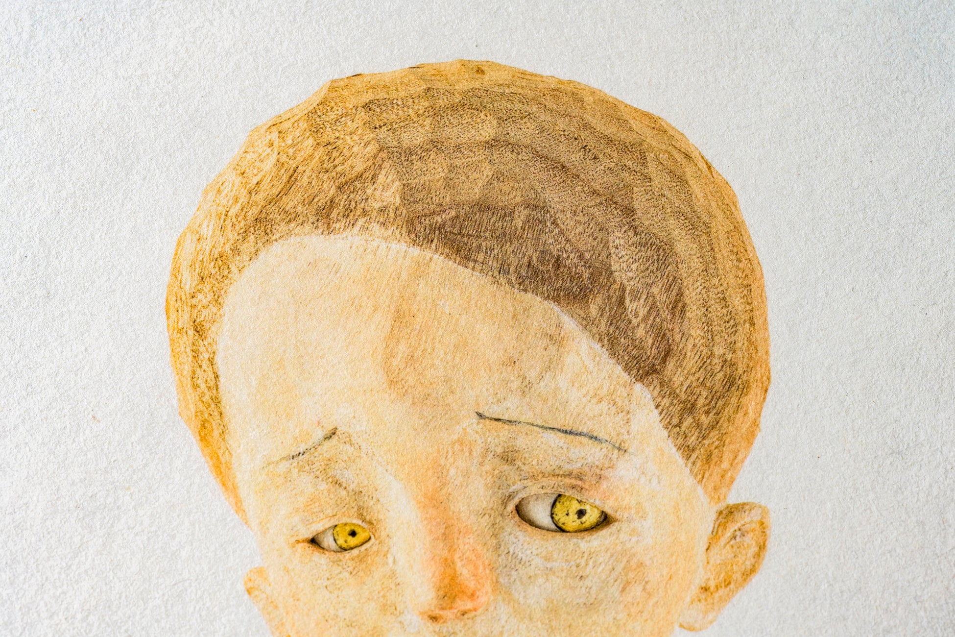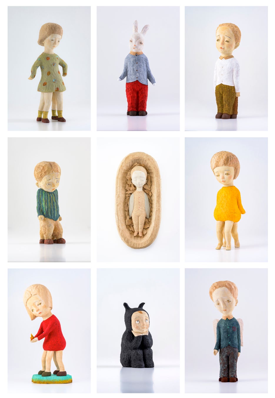 木のあたたかい質感や大胆な彫り跡、顔の繊細な表情を克明に表現するとともに、作品の奥深い世界観を作家が制作するすぐ近くから見つめ、清潔感があふれる作風によって爽やかに表現している。