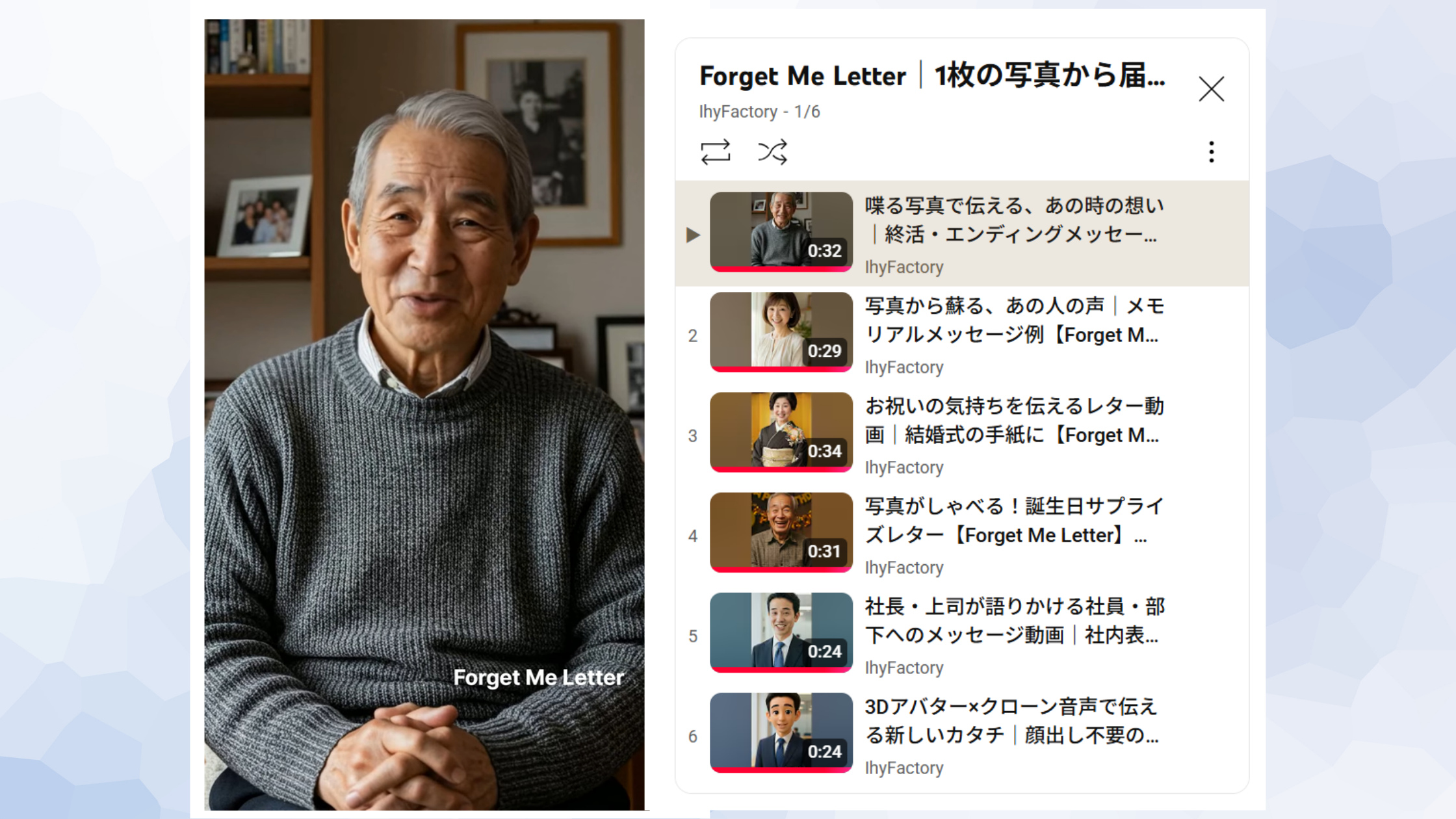「Forget Me Letter」は、写真1枚をご用意いただくだけで、AIによる自然な口パク・表情アニメーションと音声合成を組み合わせ、感情のこもったメッセージ動画を制作するサービスです。撮影や録音の手間は不要で、台本作りに不安があってもスタッフが丁寧にサポートします。