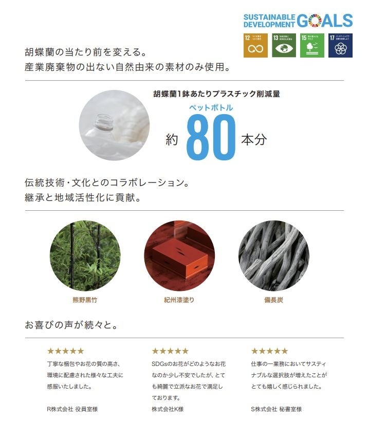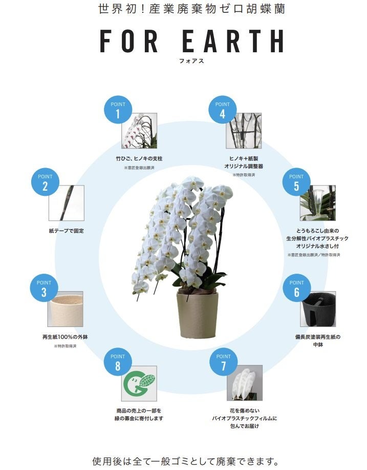 そんな中、「大切な方の大切な時に胡蝶蘭を贈る日本独自の文化を守りたい」「人にも環境にも優しい胡蝶蘭を開発すれば、もう一度多くの方に使っていただけるのではないか」との思いで、2022年にすべて自然由来の資材を使用した産業廃棄物ゼロ(一般ゴミで処分が可能)のSDGs胡蝶蘭「フォアス」を開発し、現在では150社以上の上場企業様をはじめ多くの企業様にご利用いただくまでになりました。