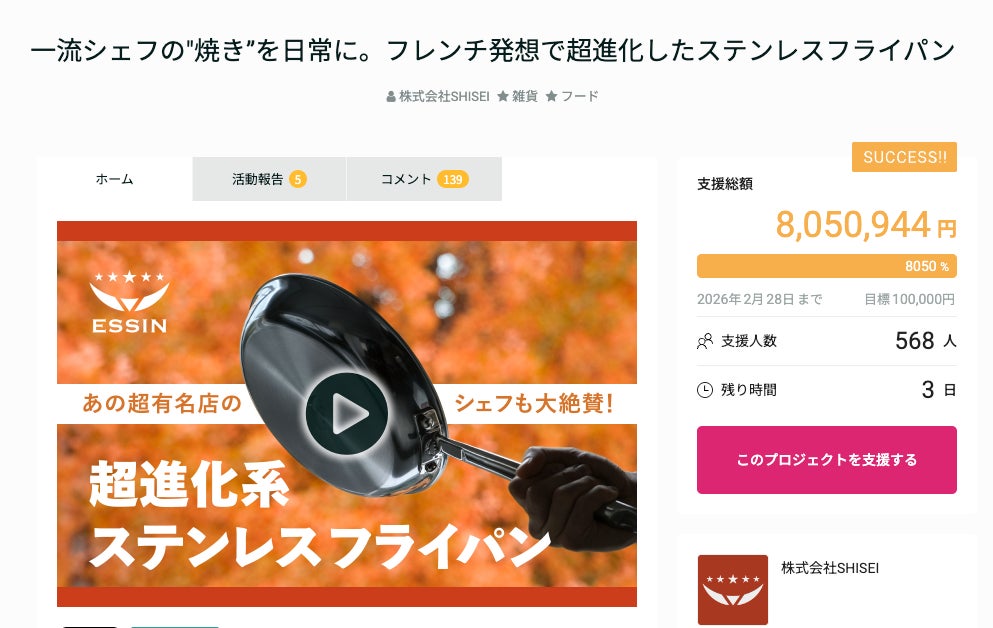 キッチンウェアブランド「ESSIN(エッシン)」がGREEN FUNDINGにて展開中のステンレスフライパンプロジェクトは、支援総額800万円・達成率8,000%・支援者568名を突破しました(2026年2月25日時点)。 また、ミシュランガイド掲載フレンチレストラン「ラチュレ」オーナーシェフ・室田拓人氏が実際に厨房で使用し、プロの現場視点で評価をいただくなど、家庭用途に留まらず、料理の第一線からも支持を集めています。
