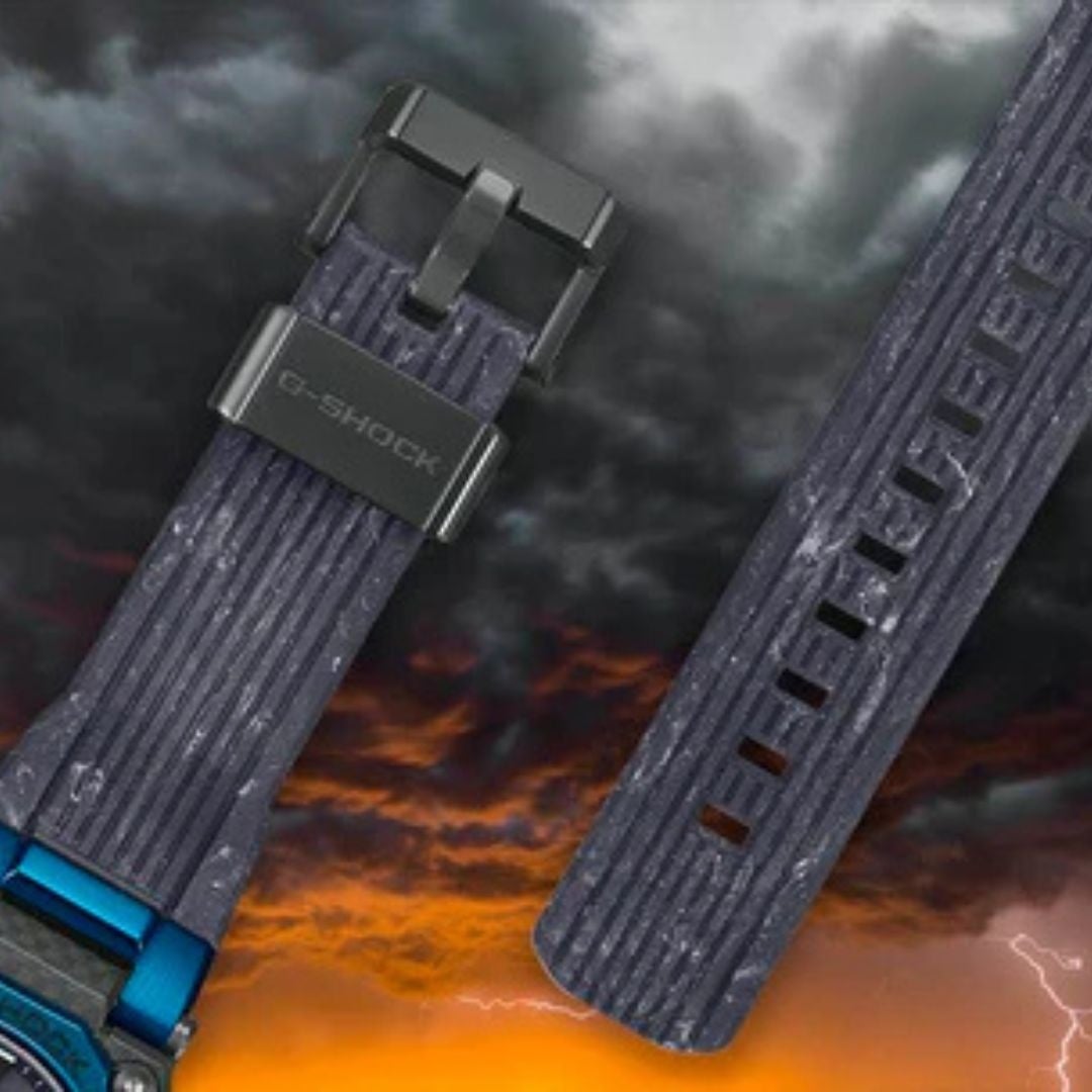 竜巻などの悪天候を追跡し、気象学の研究を行うストームチェイサーをテーマにデザインしたモデルです。 カーボンとグラスファイバーによるカーボン積層フレームは、蓄光素材により垂れ込める暗雲と一閃の稲妻を表現しました。ステンレスベゼルには2色のIPコーティングを施し、グラデーションカラーで急変する天候を表現。バンドには、しなやかで耐久性の高いソフトウレタン素材を採用し、異なる色の樹脂を混ぜ合わせて成形することで、激しい自然現象をデザインに落とし込んでいます。