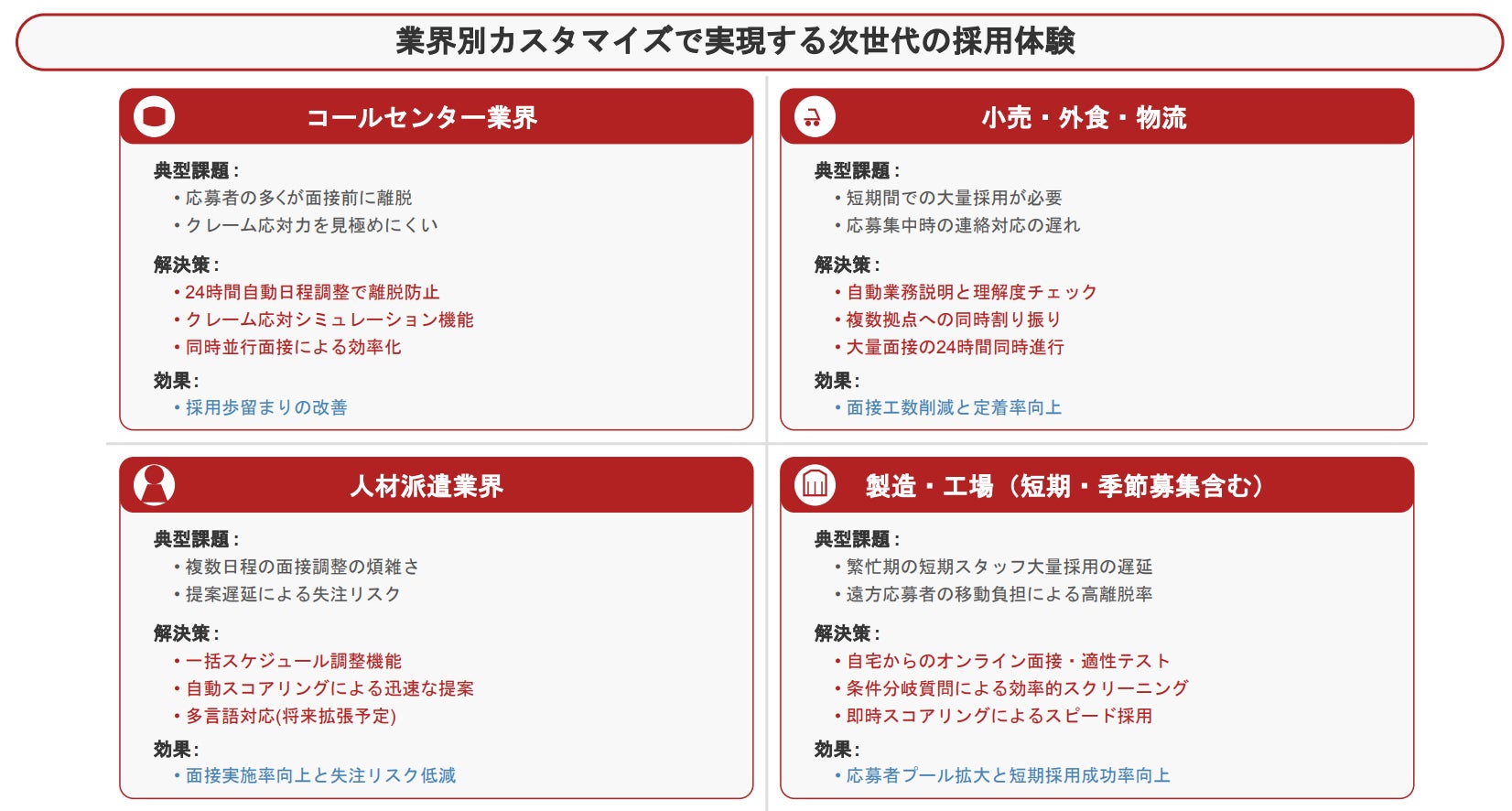 例:物流業界では身体的タスクの耐性、コールセンターではストレス耐性や音声品質などを重視したAI評価軸に対応。