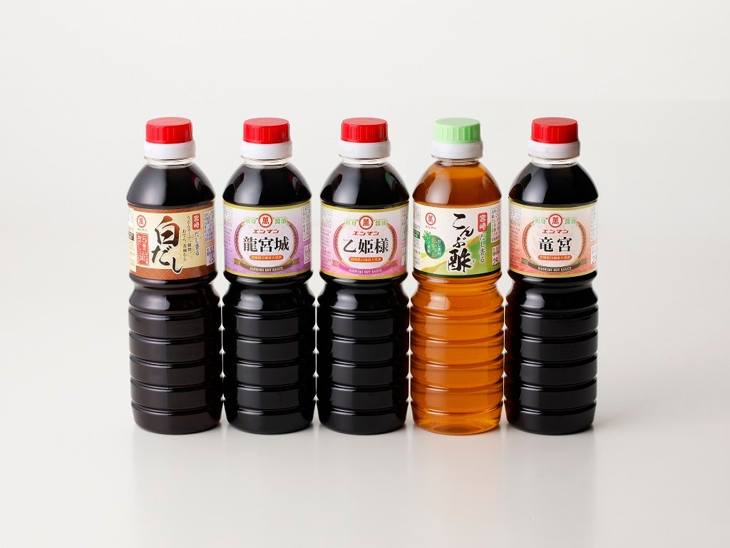 宮崎県日南市大堂津にある竹井醸造では、1920年(大正9年)の創業より、エンマン醤油の屋号で醤油の販売を行っています。南九州エリア特有の甘い醤油が特徴です。今回は、それぞれ甘さが違う刺身醬油3種(乙姫様・竜宮城・竜宮)と、花かつお・昆布・酢を絶妙なバランスで調合した人気の「こんぶ酢」、しいたけ・いりこ・昆布・鰹などを使った、風味豊かな味わいの「白だし」のセットをご用意。日南の味を、ご家庭でもお楽しみください。