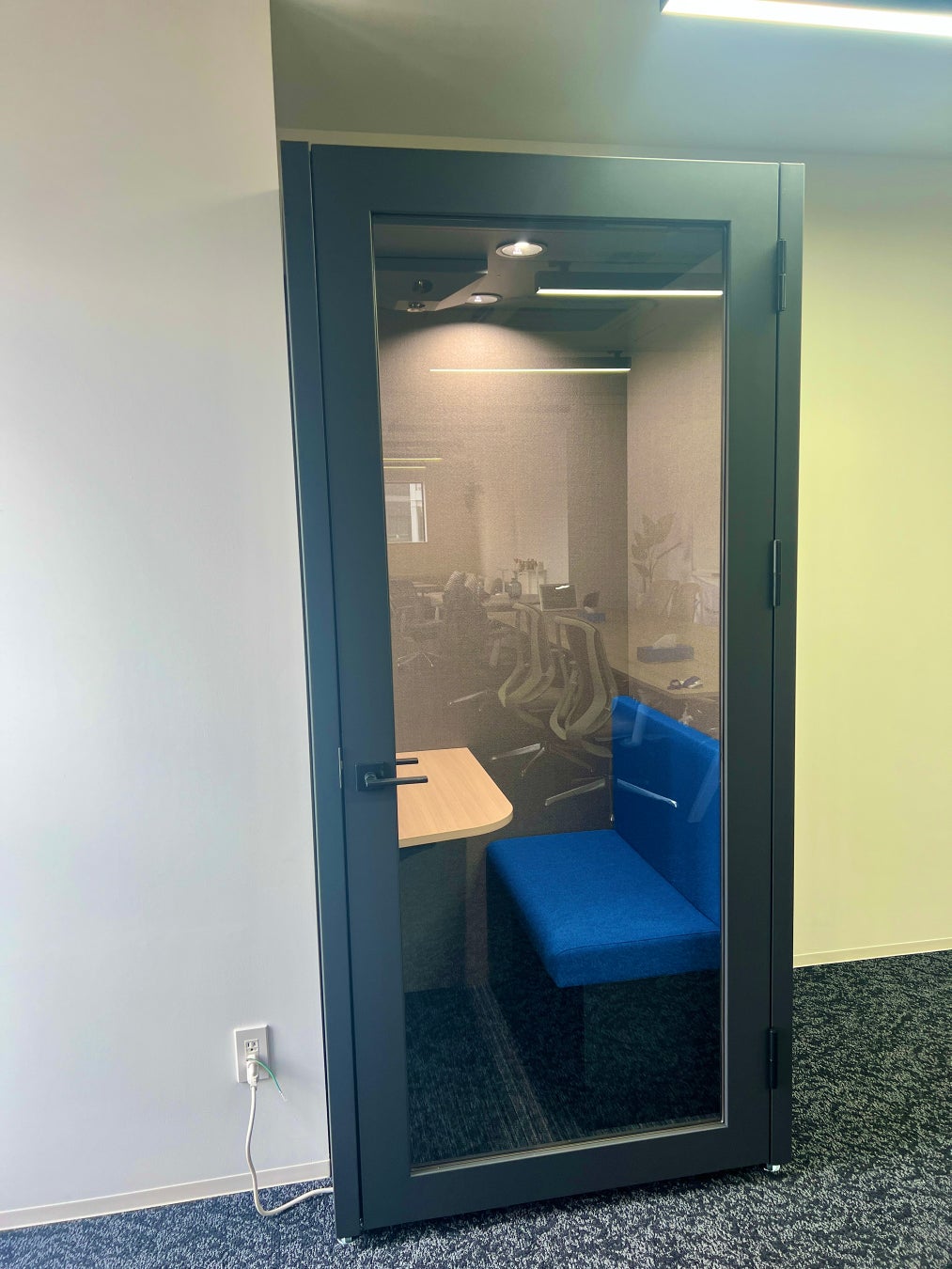 オンラインミーティングや集中したい業務のために、遮音性のあるフォンブースを設置。オフィスにいても一人になれるスペースを確保。