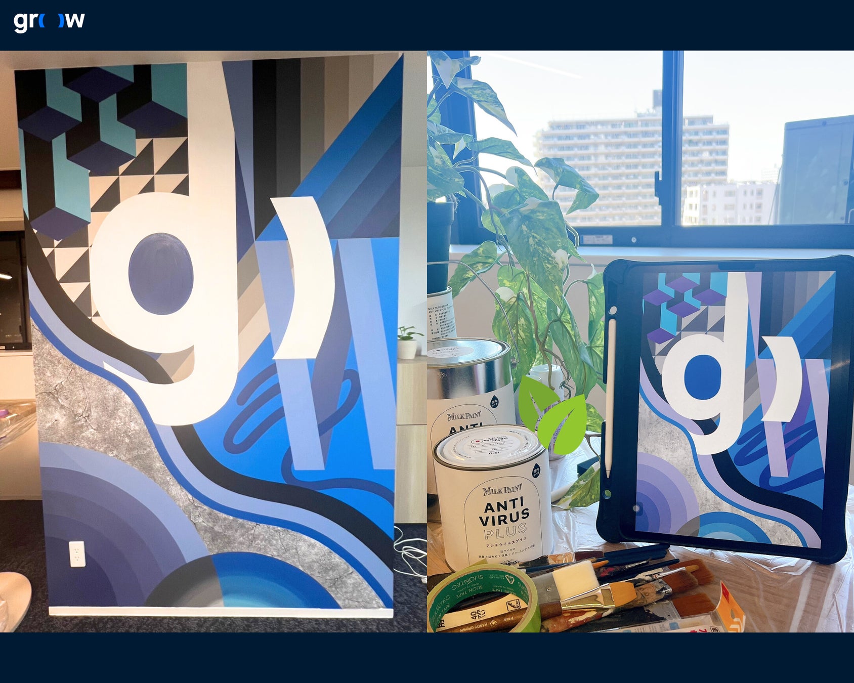 デザインにもこだわり、ブランドカルチャーを自然に感じられる空間に仕上げました。Growらしさを体現する壁紙アート(WIP)とGrow Blue:デザインにもこだわり、ブランドの世界観を表現。