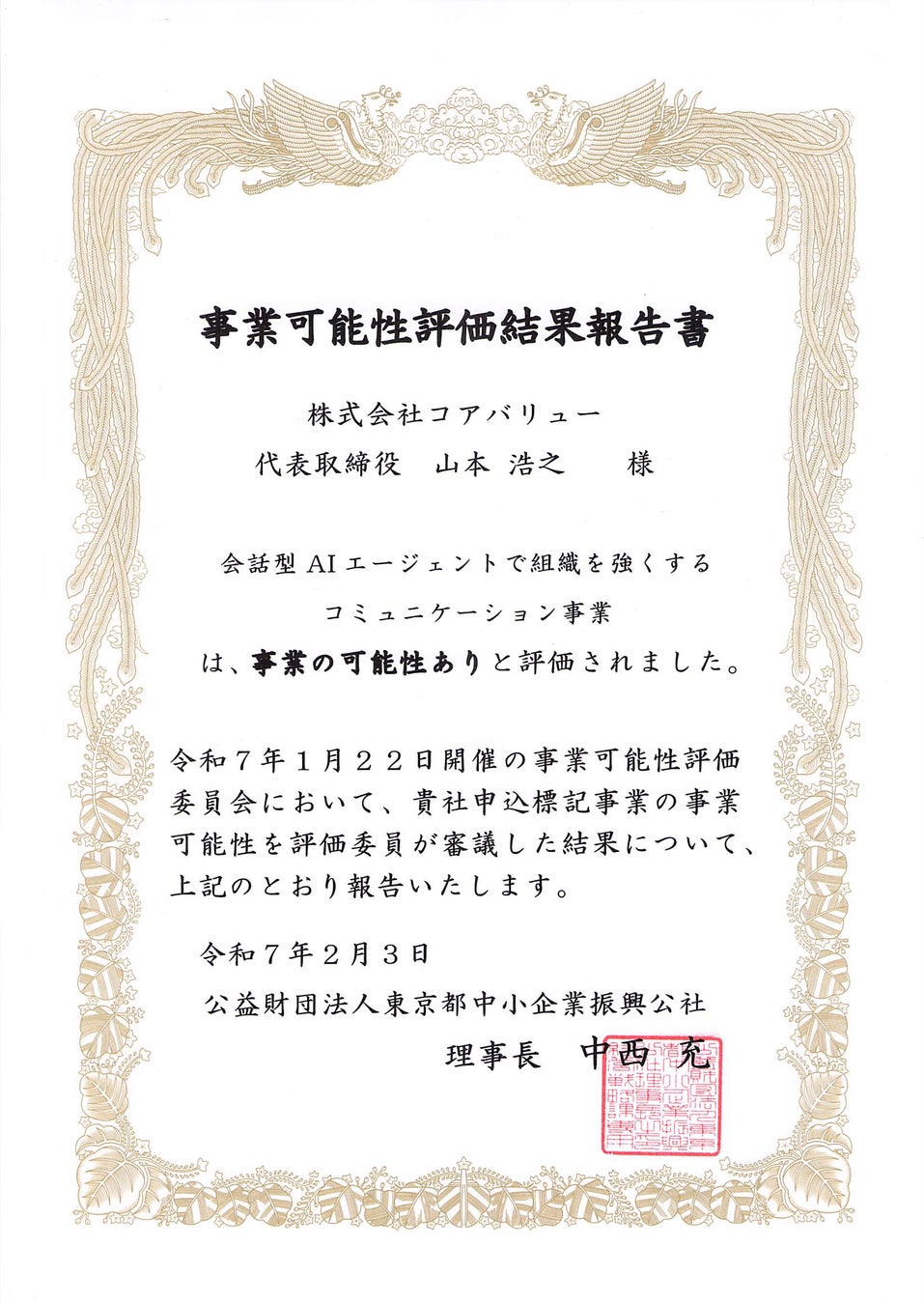 会話型AIエージェント ValueTalk が、東京都中小企業振興公社から「事業可能性あり」と評価されました。