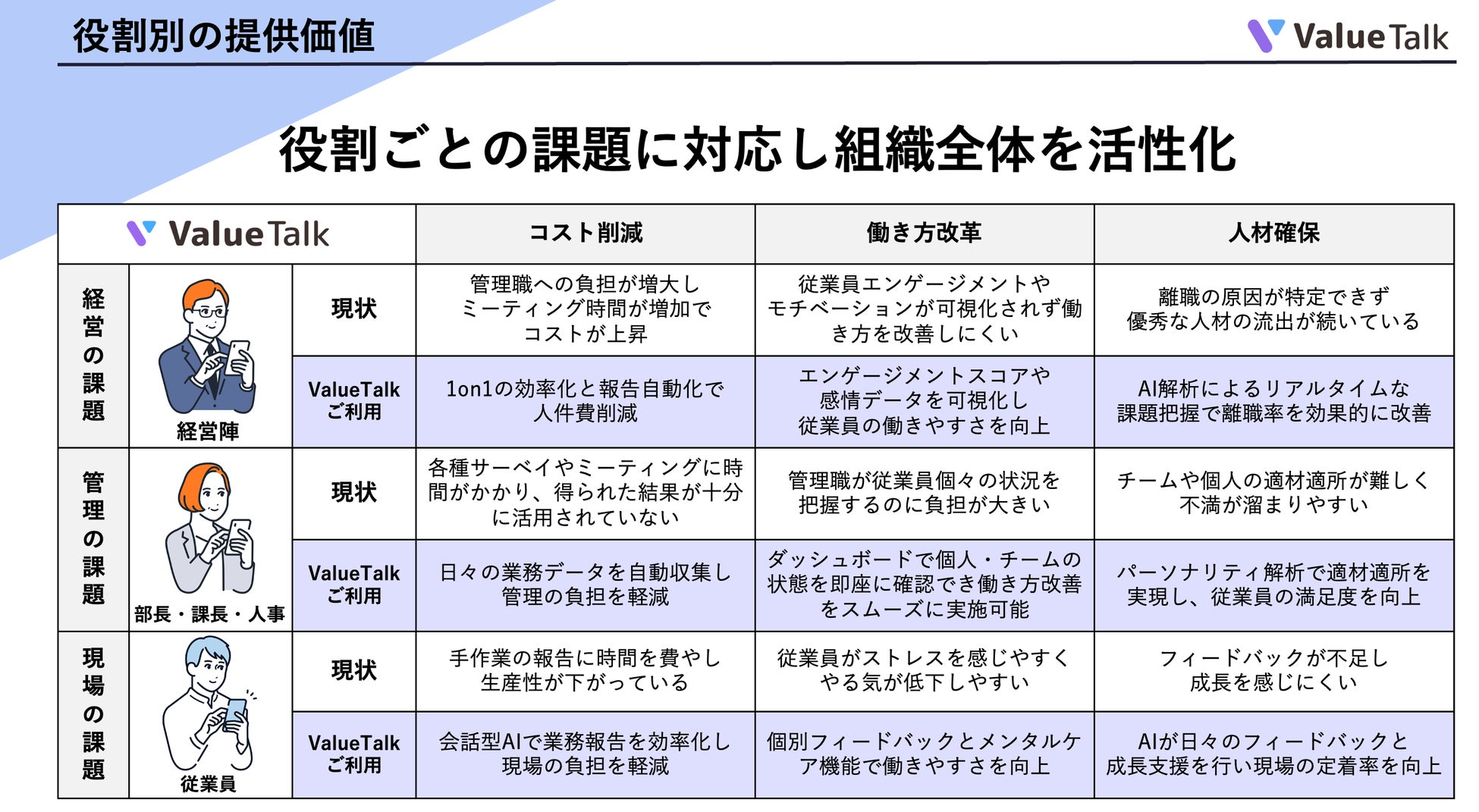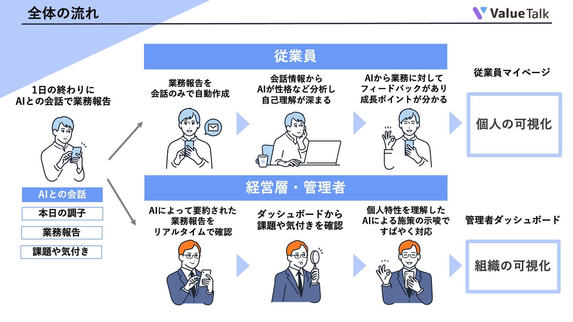 「ValueTalk」は、会話型AIを活用して業務報告を効率化し、組織力の向上を支援する次世代型エンゲージメントソリューションです。従業員との会話を通じて、業務進捗や個々の特性をリアルタイムで分析し、課題の早期発見と迅速な対応をサポートします。また、個別フィードバック機能により、従業員の自己理解を深め、成長とモチベーション向上を促進します。