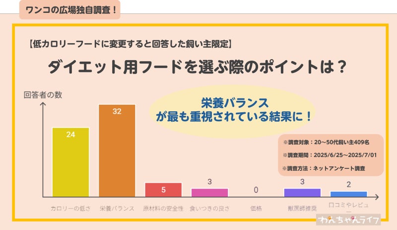 上記の通り、低カロリードッグフードを選ぶ際に重視されていることは「栄養バランス」という結果になりました。