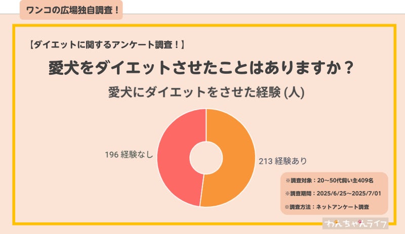 近年、動物病院かかる犬の肥満率が増加しており多くの飼い主が愛犬のダイエットを行っている背景があります。一方で犬のダイエット方法や食事管理の情報が少ない現状があります。そこで実際飼い主にアンケート調査を行いどのようにダイエットを行っているのか調査を行いました。