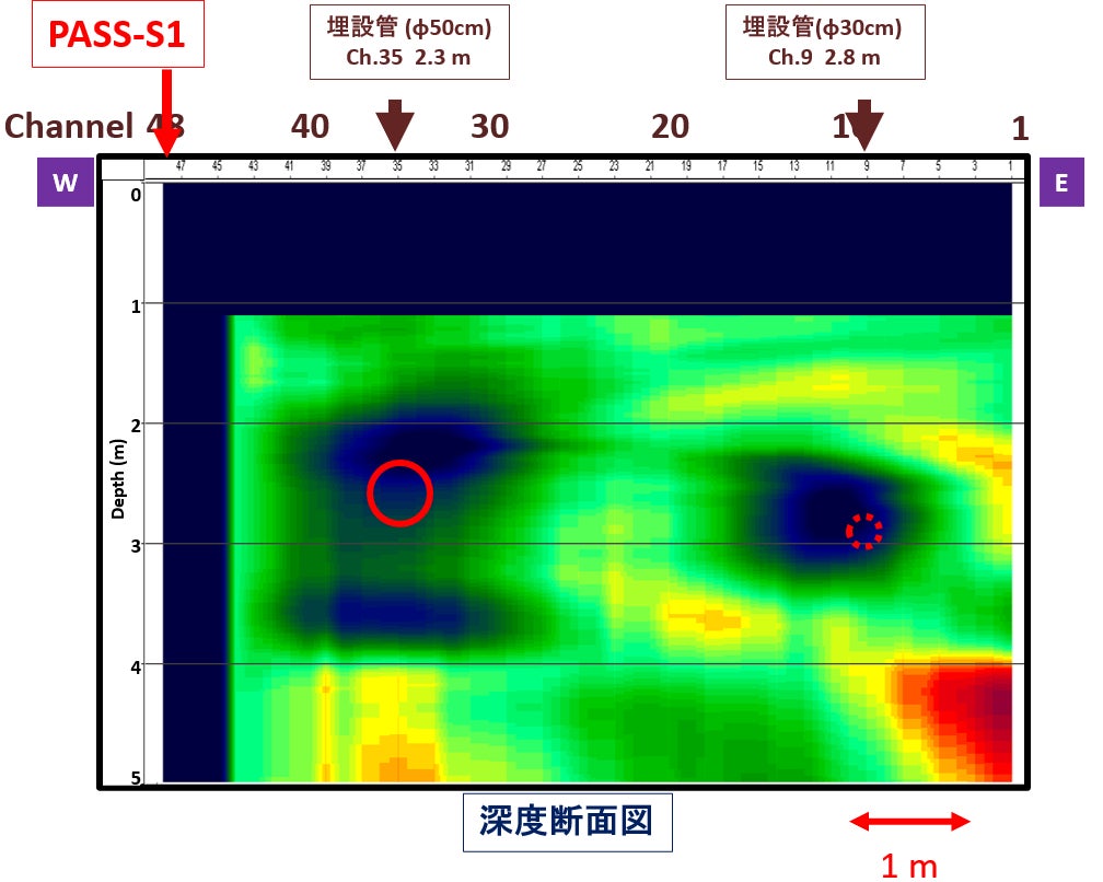 "PASS" is a small and lightweight vibration source device that enables exploration in locations where conventional methods have struggled. In this demonstration test, "PASS" was used as a seismic source. By analyzing vibrations that traveled through the ground, the position of buried objects at a depth of up to 4 meters was identified. Through the analysis, the approximate position of a buried water pipe was estimated.