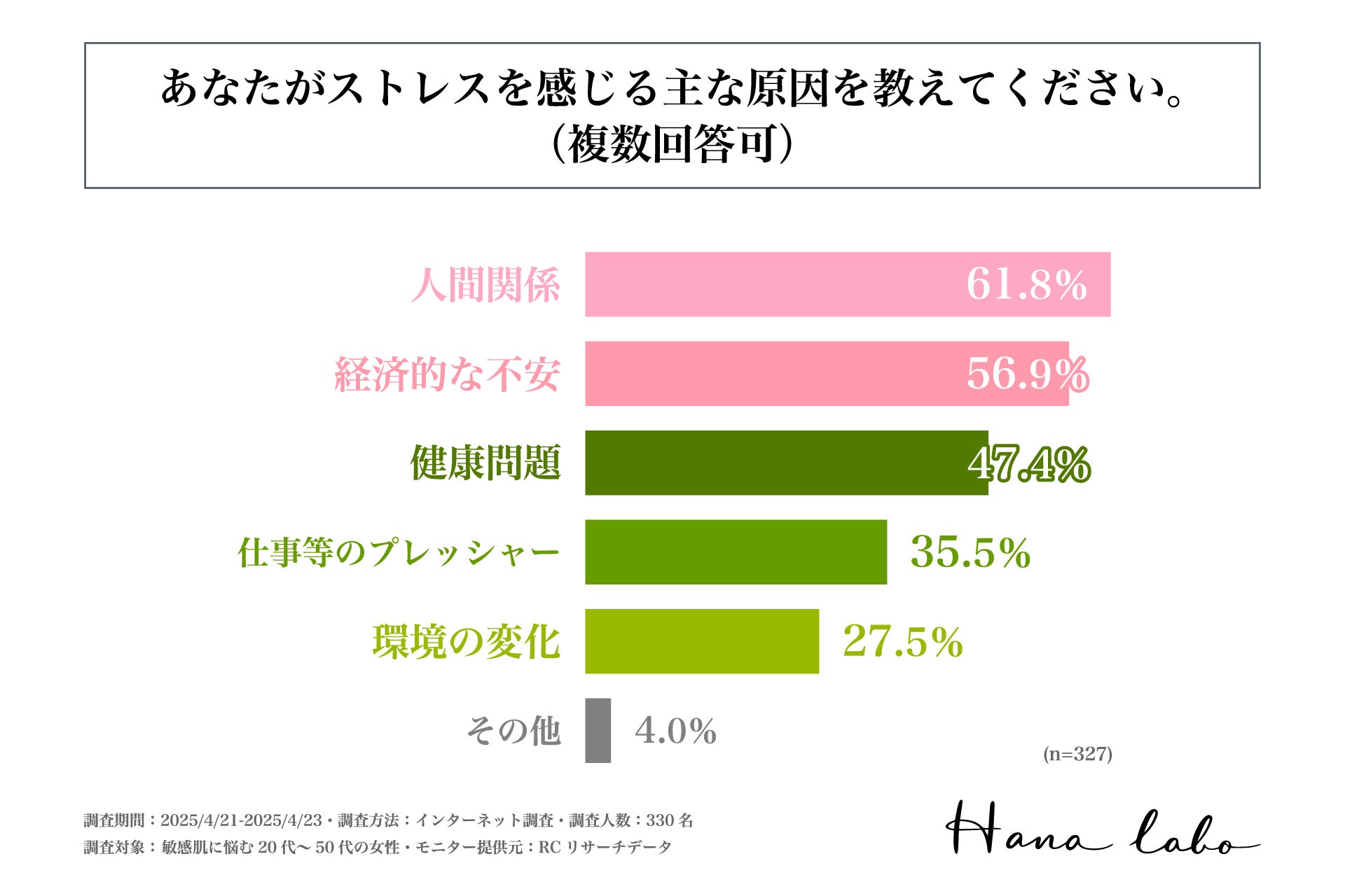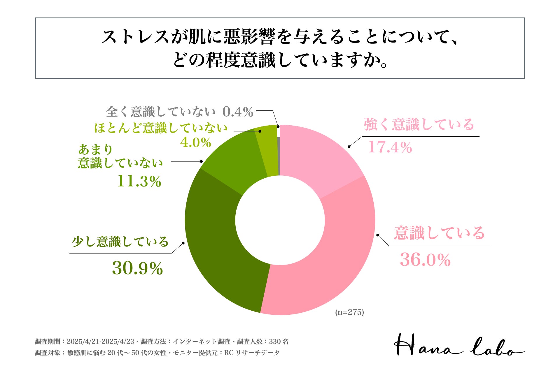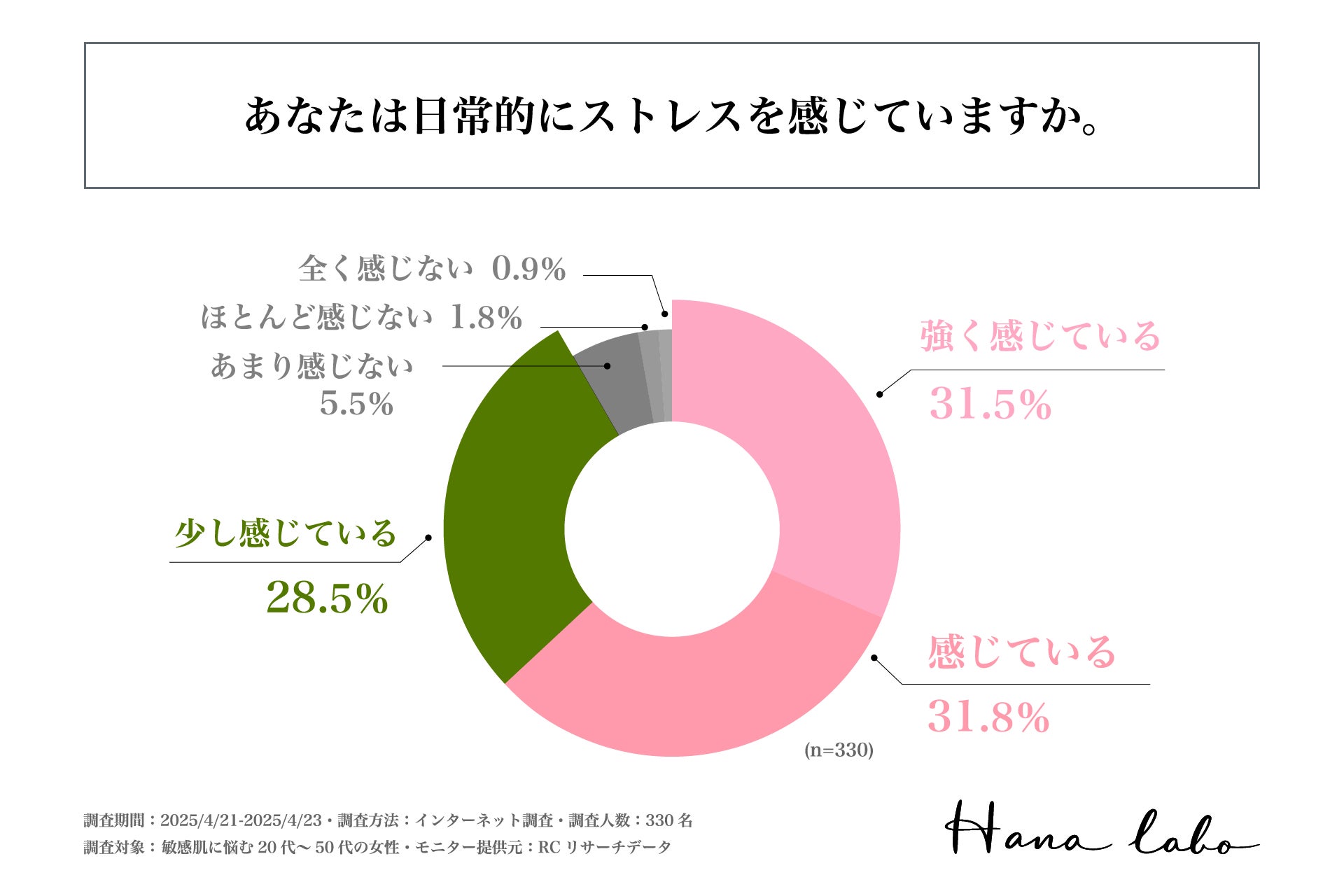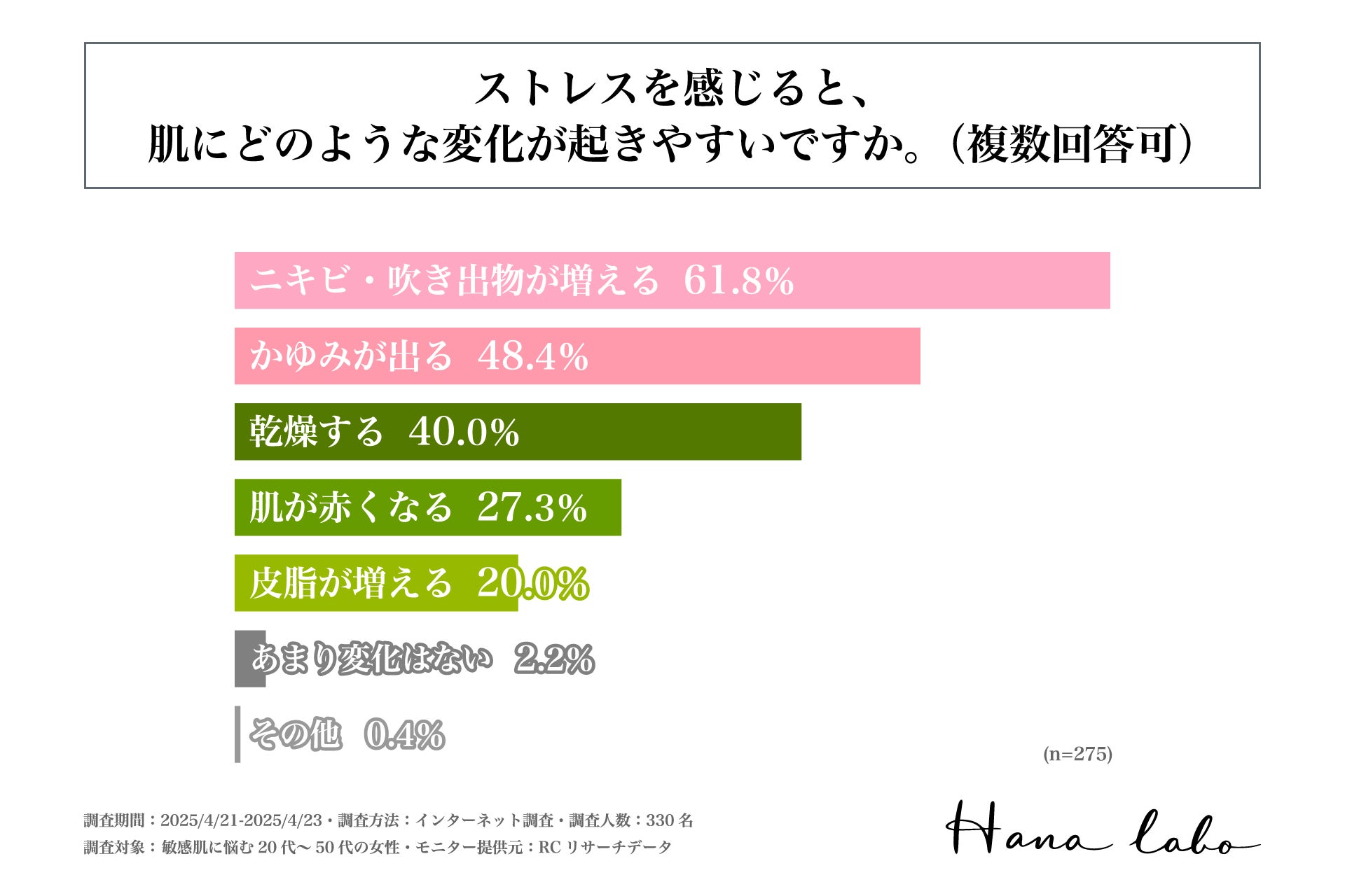 5月は新年度の環境の変化や仕事・人間関係の溜まっていたストレスが表面化する時期です。また近年、ストレスと肌トラブルの関連性が注目されており、「ストレスが肌の状況を悪化させる」という実感がある人は多いのではないでしょうか。また、敏感肌の方であれば、その影響も顕著に感じるものと思われます。そこで「HANA LABO」は、敏感肌に悩む20代~50代の女性を対象に「ストレスと肌トラブルの関係性」に関する調査を実施しました。