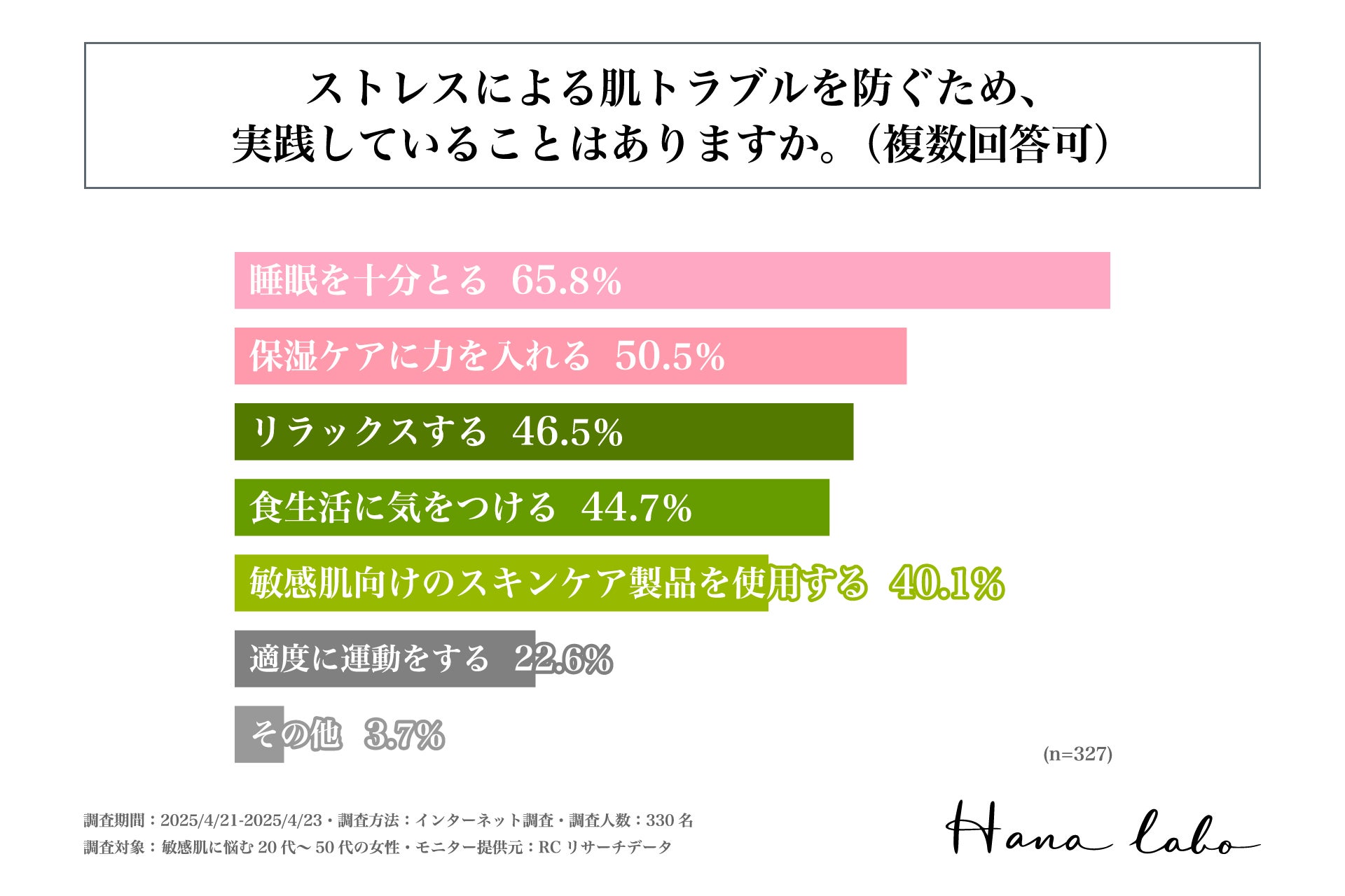 調査の最後、日常的にストレスを感じていると回答された方を対象に「ストレスによる肌トラブルを防ぐため、実践していること」を尋ねる設問への回答では、1位が「睡眠を十分とる」で65.8%、2位が「保湿ケアに力を入れる」で50.5%、3位が「リラックスする」で46.5%という結果になりました。この結果から、ストレスによる肌トラブルを防ぐために実践していることは、主に「心身を休ませること」や「保湿ケアに力を入れること」であることが明らかになりました。