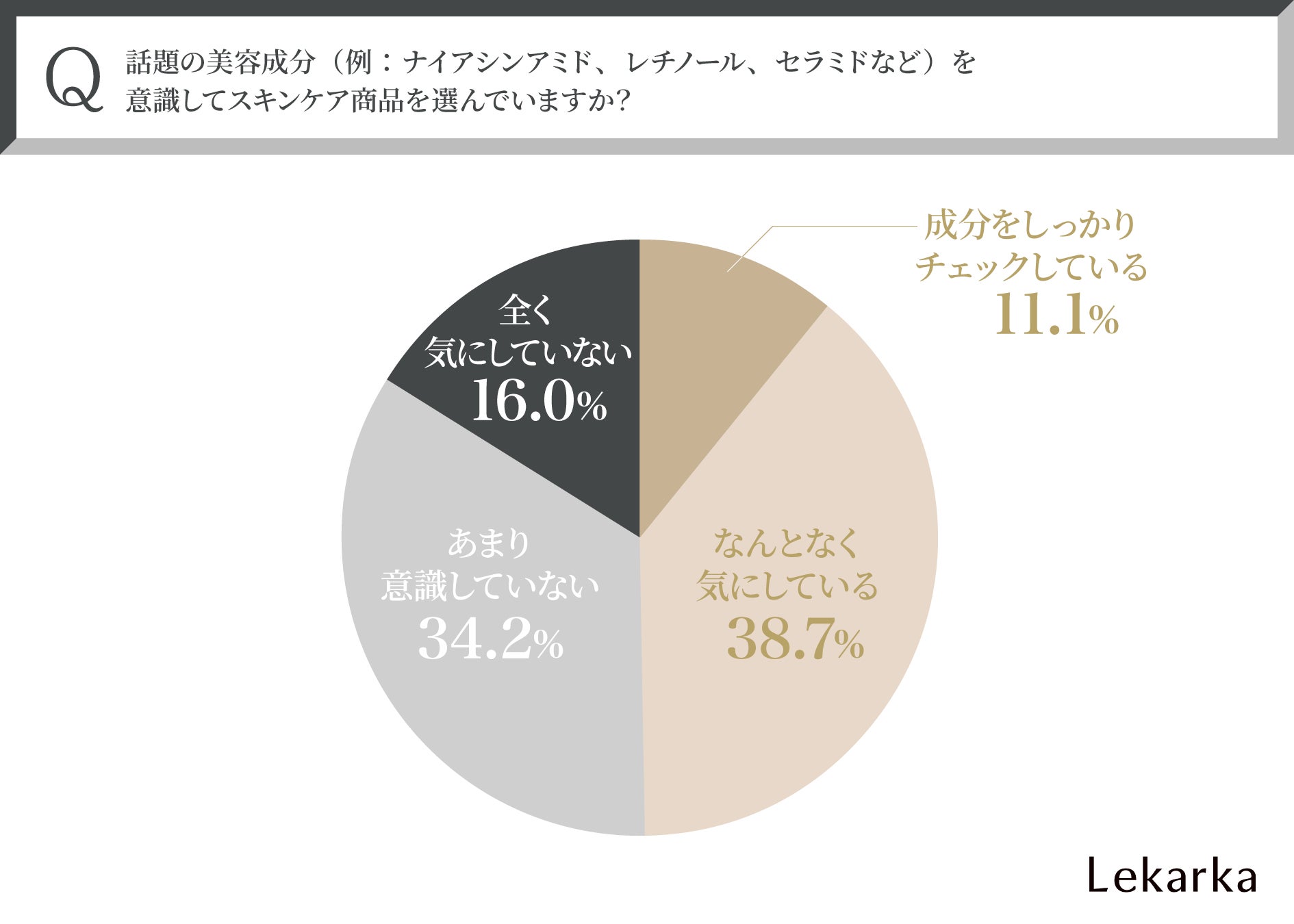 美容成分に対する意識については、「成分をしっかりチェックしている」(11.1%)と「なんとなく気にしている」(38.7%)を合わせると49.8%となり、約半数の女性が何らかの形で成分に注目していることがわかります。特に「なんとなく気にしている」層が最も多いことから、成分に対する関心はあるものの、詳細な知識や理解はまだ十分ではない状況が推測されます。