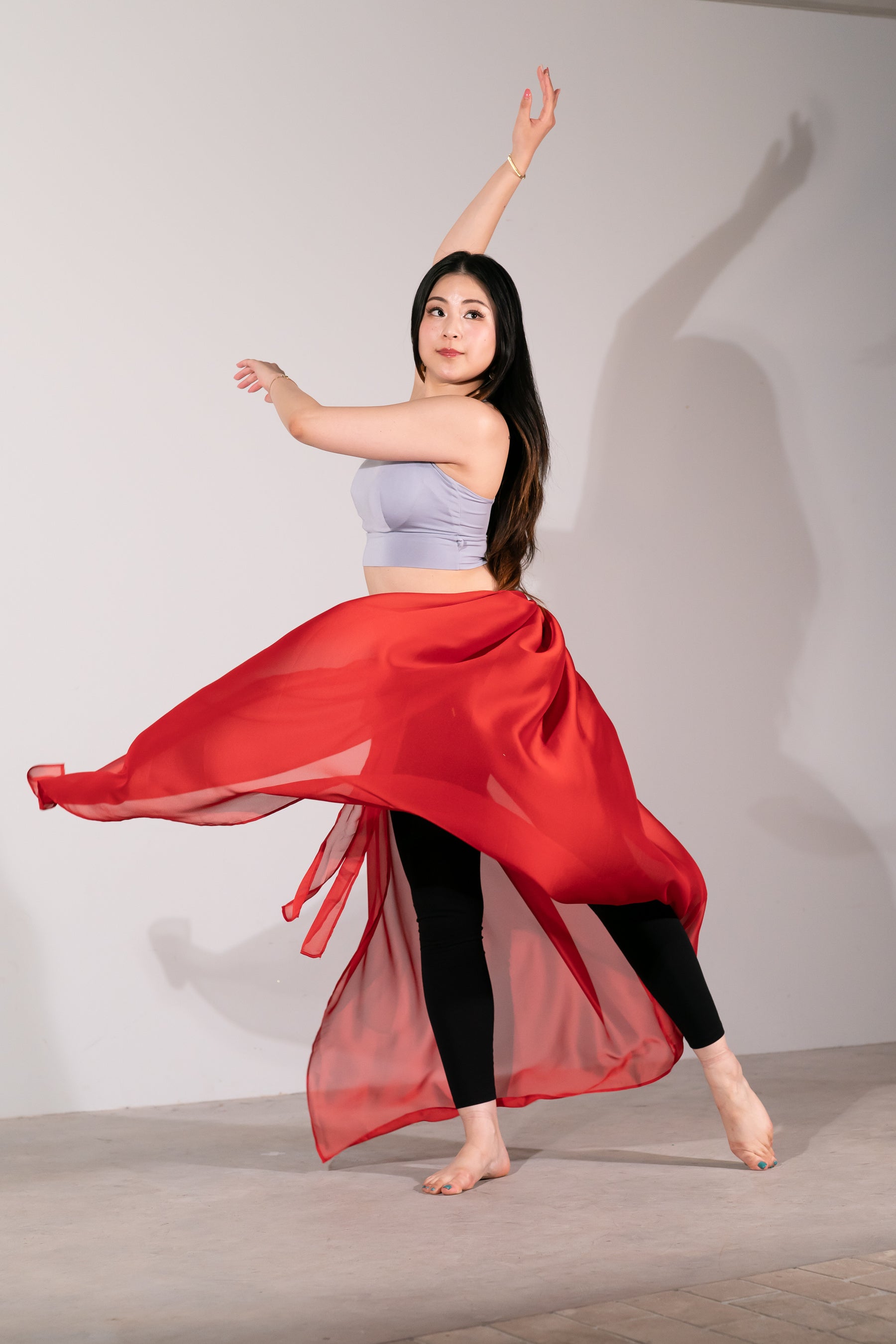 衣装のスカートを効果的に使うテクニックを練習するための巻きスカートです。光沢があり、空気をつかむとても軽い生地なので、つまんだりターンするとふわっとしてテンションも上がります。ミラーやストーンが付いたおしゃれベルトも付いてきます。ベルトは付け外しが可能なため、スカートだけ洗うことが可能です。ベルトは他のレッスン着とコーディネートしても使用いただけます。