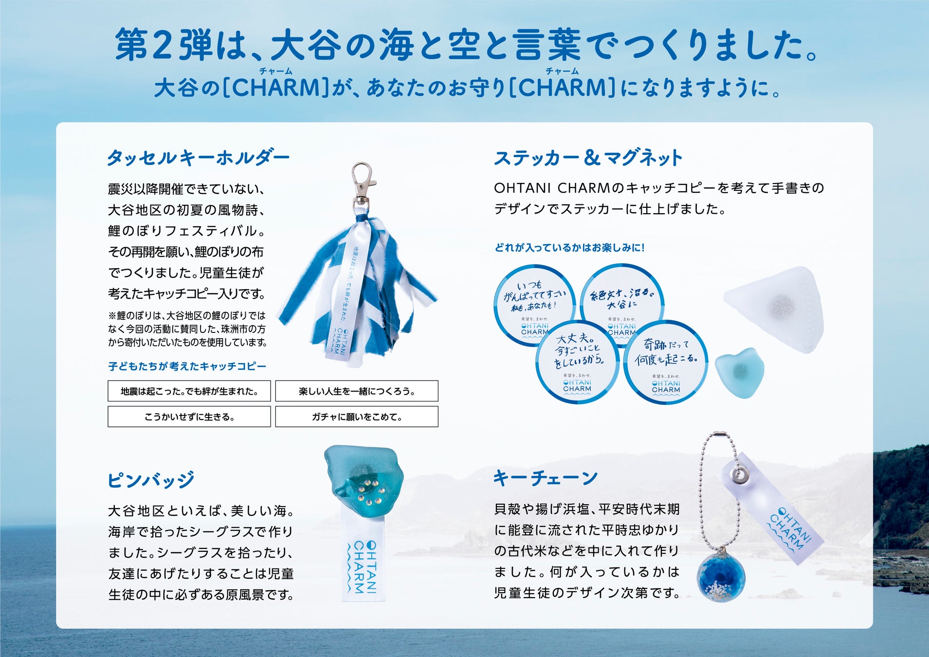 シーグラスや貝殻などを使った商品からはじまったOHTANI CHARMですが、第2弾には、さらに想いを詰め込むべく、新しい商品も生まれました。1つ目は、大谷地区の「鯉のぼりフェスティバル」の復活を願うタッセルキーホルダー。「鯉のぼりフェスティバル」は、数多の鯉のぼりがたゆたう大谷地区の初夏の風物詩ですが、震災以降、開催できていません。その再開を願って、制作しました。(※1)2つ目は、児童生徒が書いた言葉の入ったステッカー。OHTANI CHARMのキャッチコピーを児童生徒が考えて制作しました。また児童生徒の熱量が地域の大人たちを巻き込んだ結果、タッセルキーホルダーは学校に隣接する仮設住宅に暮らす大人の方々と一緒に作ることになりました。これは第2弾からの取り組みです。子どもたちが大人たちを巻き込み、“大谷ガチャ”OHTANI CHARMを通して地域の絆を強固にしながら、大谷地区の魅力を外に発信していきます。