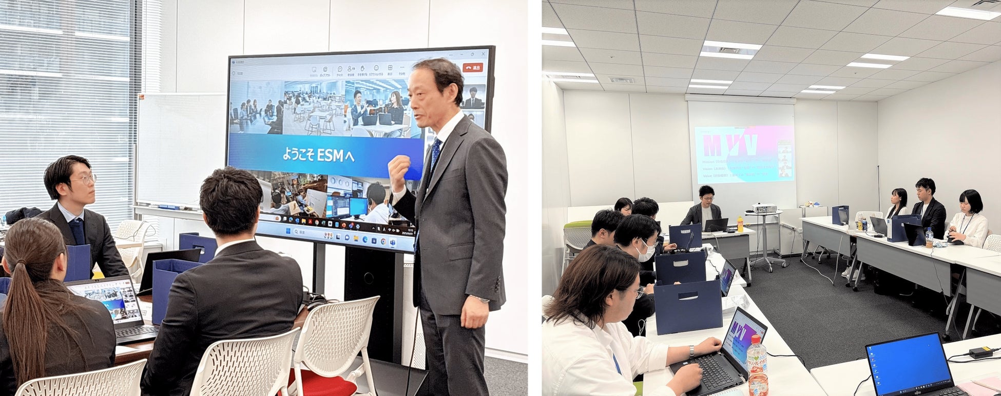 大阪支店の社員ともリモートでつなぎながら、代表の深山より、ESMのビジョンや社会人としての基本姿勢についての対話があり、その後は、グループワーク形式でMVV(ミッション・ビジョン・バリュー)を深掘りするセッションやコンセンサスゲームを通じて、合意形成やチームビルディングの大切さを体感するプログラムを実施しました。