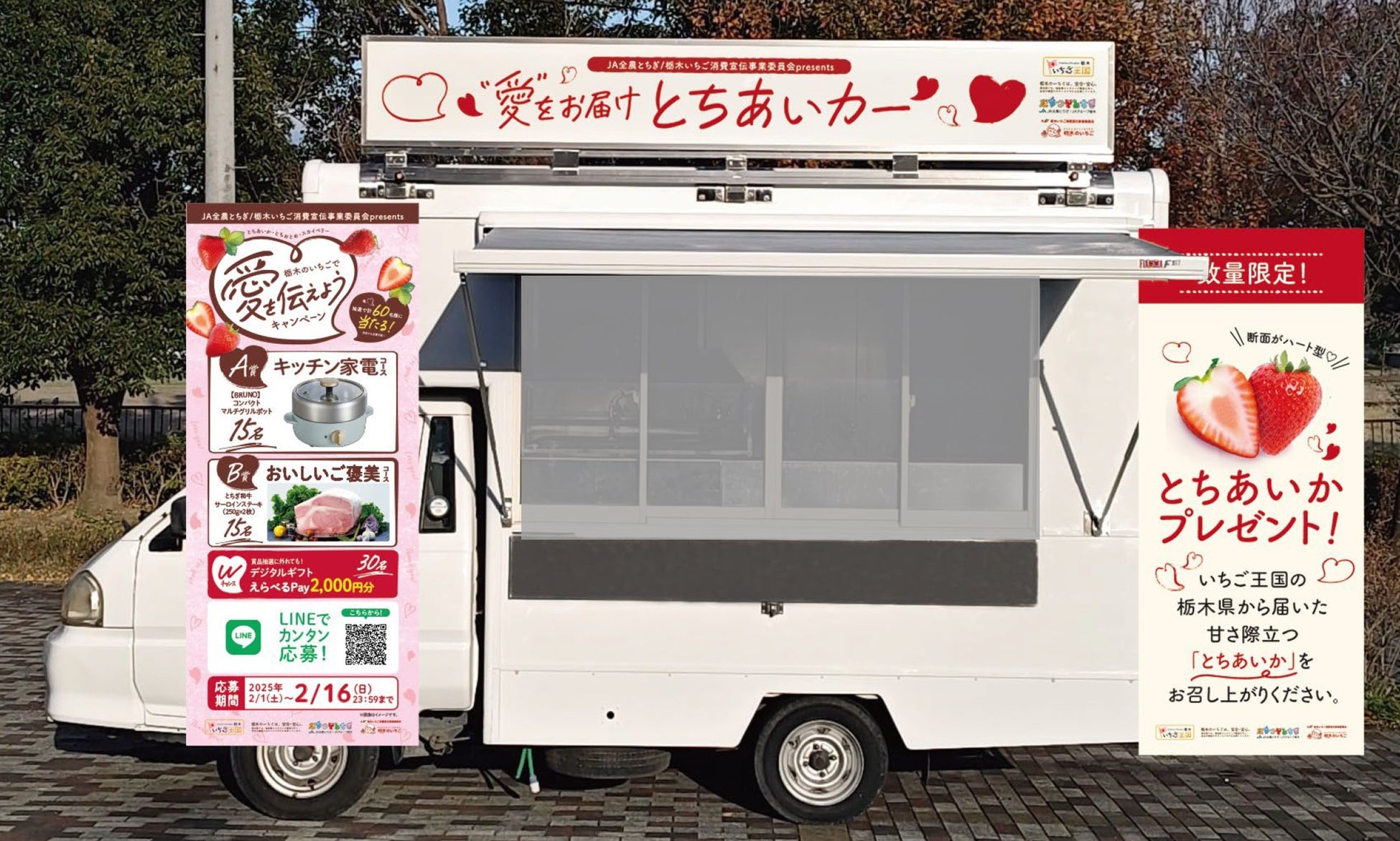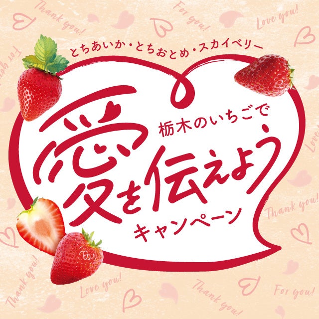 “とちあいか”のハート形から連想される「愛」にちなみ、「愛を伝える」ことをテーマにした「栃木のいちごで愛を伝えようキャンペーン」を実施します。対象商品(栃木県産とちあいか、とちおとめ、スカイベリー)を購入し、キャンペーンLINEアカウントからご応募いただいた方の中から抽選で、豪華賞品をプレゼントいたします。ぜひ、贈りもの、またご家族やご自身へのご褒美として栃木のいちごをお試しください。