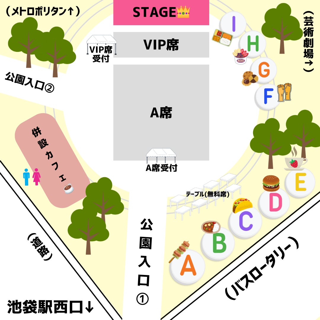 当日ステージの前には、300〜400席が設置されます。イベントを存分に楽しめる、A席チケットの販売中!座ってゆったり食事を楽しみながら、ステージの迫力や、出演者たちの熱気をよりリアルに体感できる最高のポジションです。