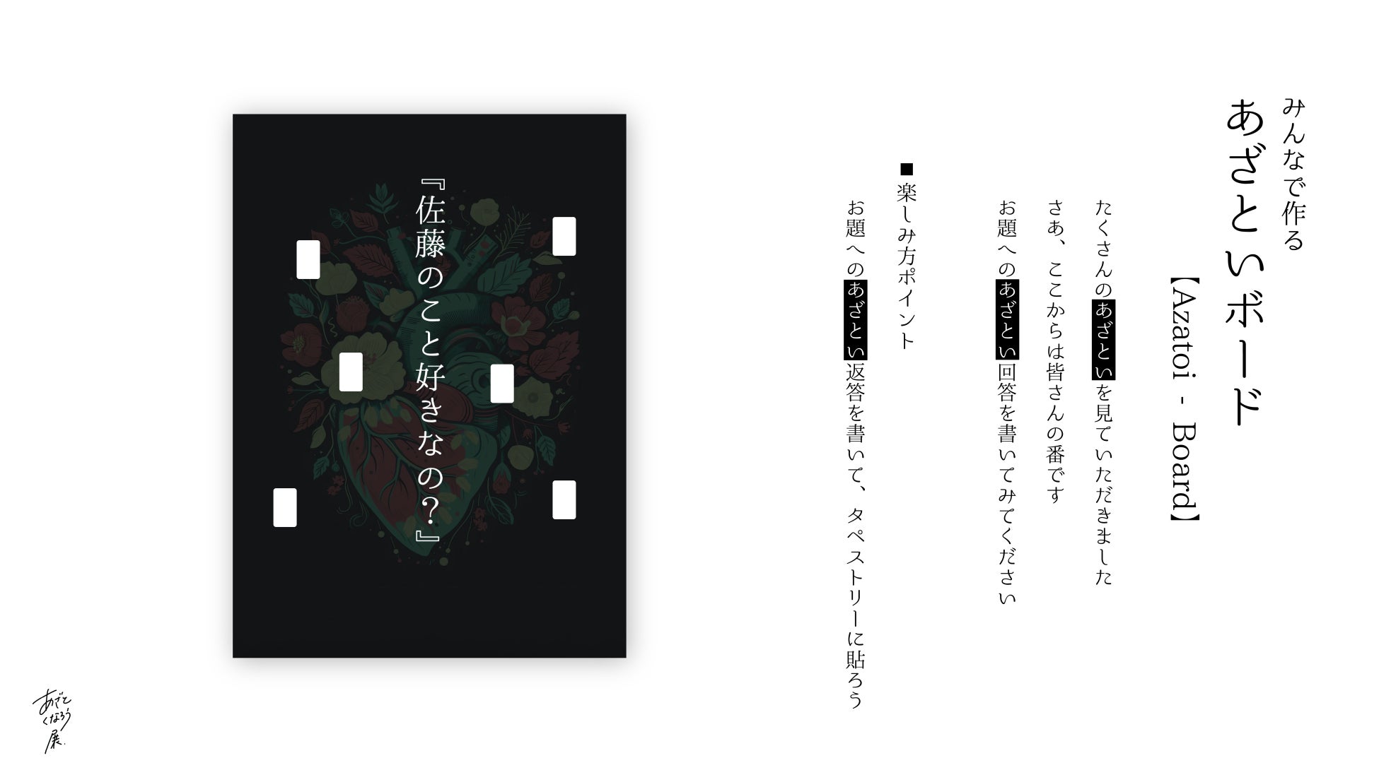 そんなボードゲームの中で"映える"ボードゲームとして、SNSにて1万いいね以上の反響や人気アイドル乃木坂46のニコニコ生配信にて使用されるなど、大きな注目を集めるボードゲーム「あざとカルタ」を体験型で楽しめる展示を実施いたします。