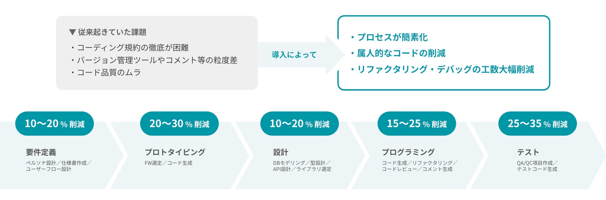 要件定義から設計、プログラミング、テスト、運用に至るまでの各フェーズで、工数を10~35%削減