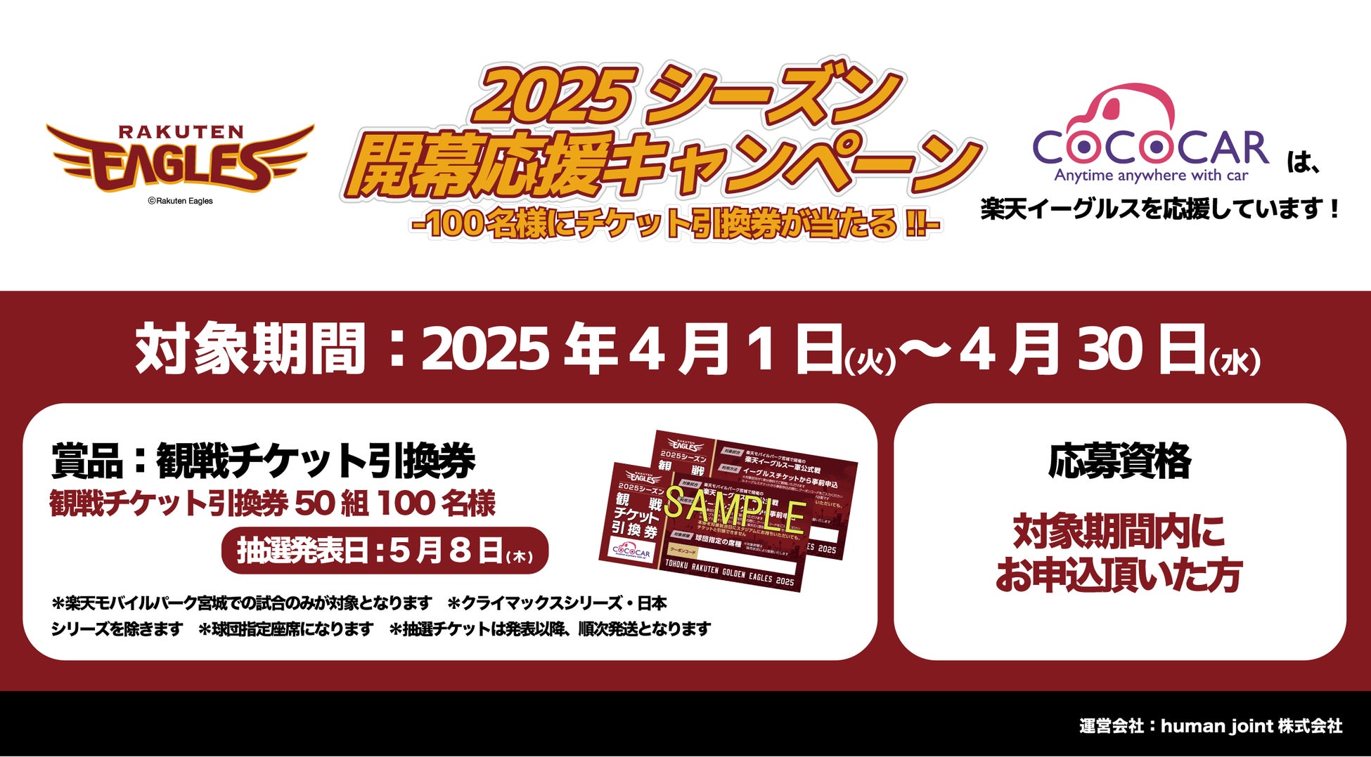 COCOCARを運営するhuman jointでは、さまざまなイベントを通じてお客様へ充実したカーライフを提供しております。また今年1月より、弊社代表の出身地である東北地方を拠点に活躍する東北楽天ゴールデンイーグルスとオフィシャルスポンサー契約を締結いたしました。今回は、プロ野球2025シリーズの開幕を記念し、期間中にCOCOCARのローン審査にお申し込みいただいた方の中から、50組100名様に観戦チケット引換券が当たる「楽天イーグルス開幕応援キャンペーン」を実施いたします。